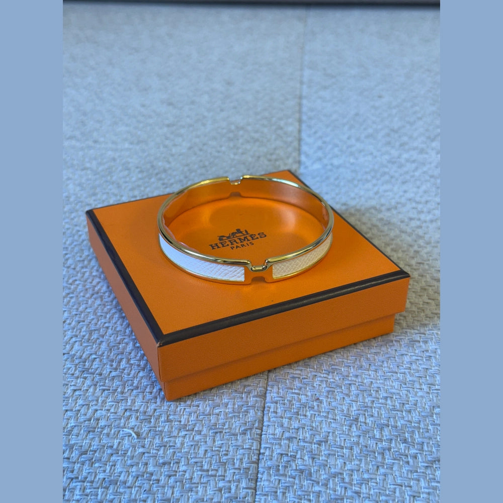 Add a touch of timeless elegance to your collection with this stunning Hermès Olympe bracelet. Crafted in sleek white enamel with gold plated hardware, this piece is a refined accessory that pairs effortlessly with both casual and formal looks.