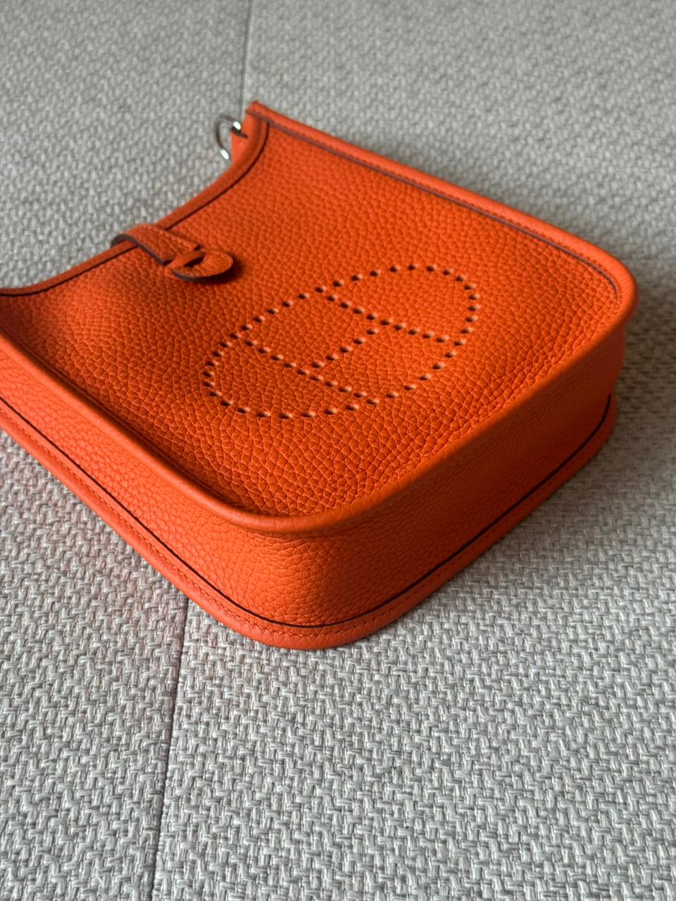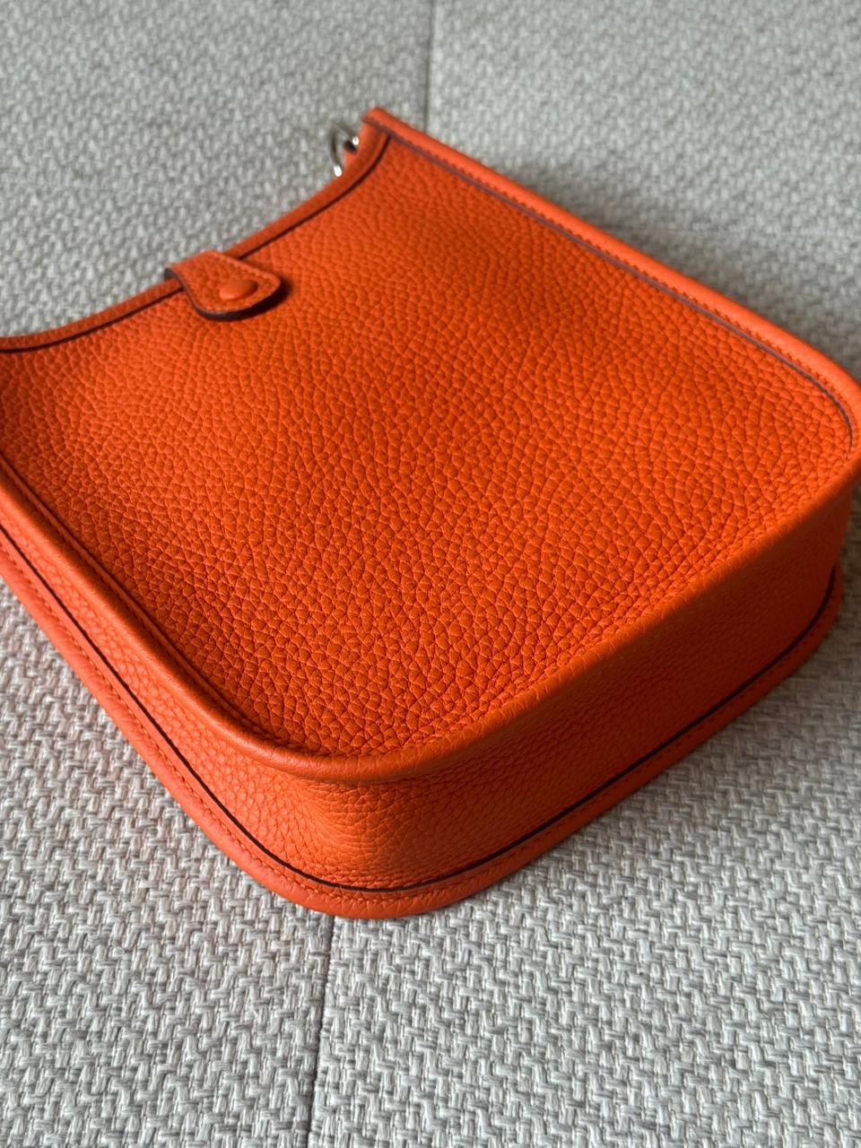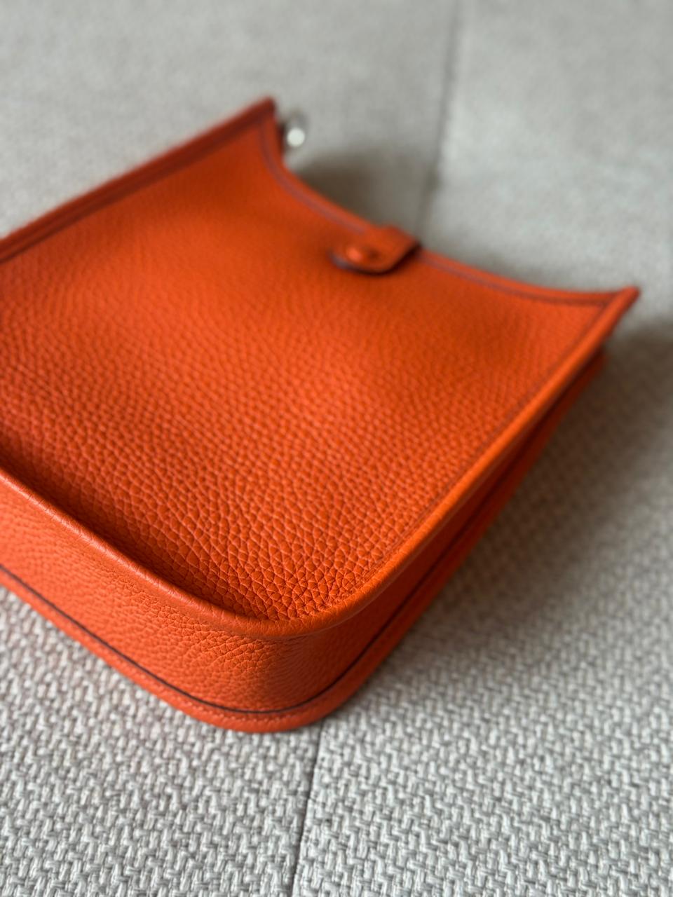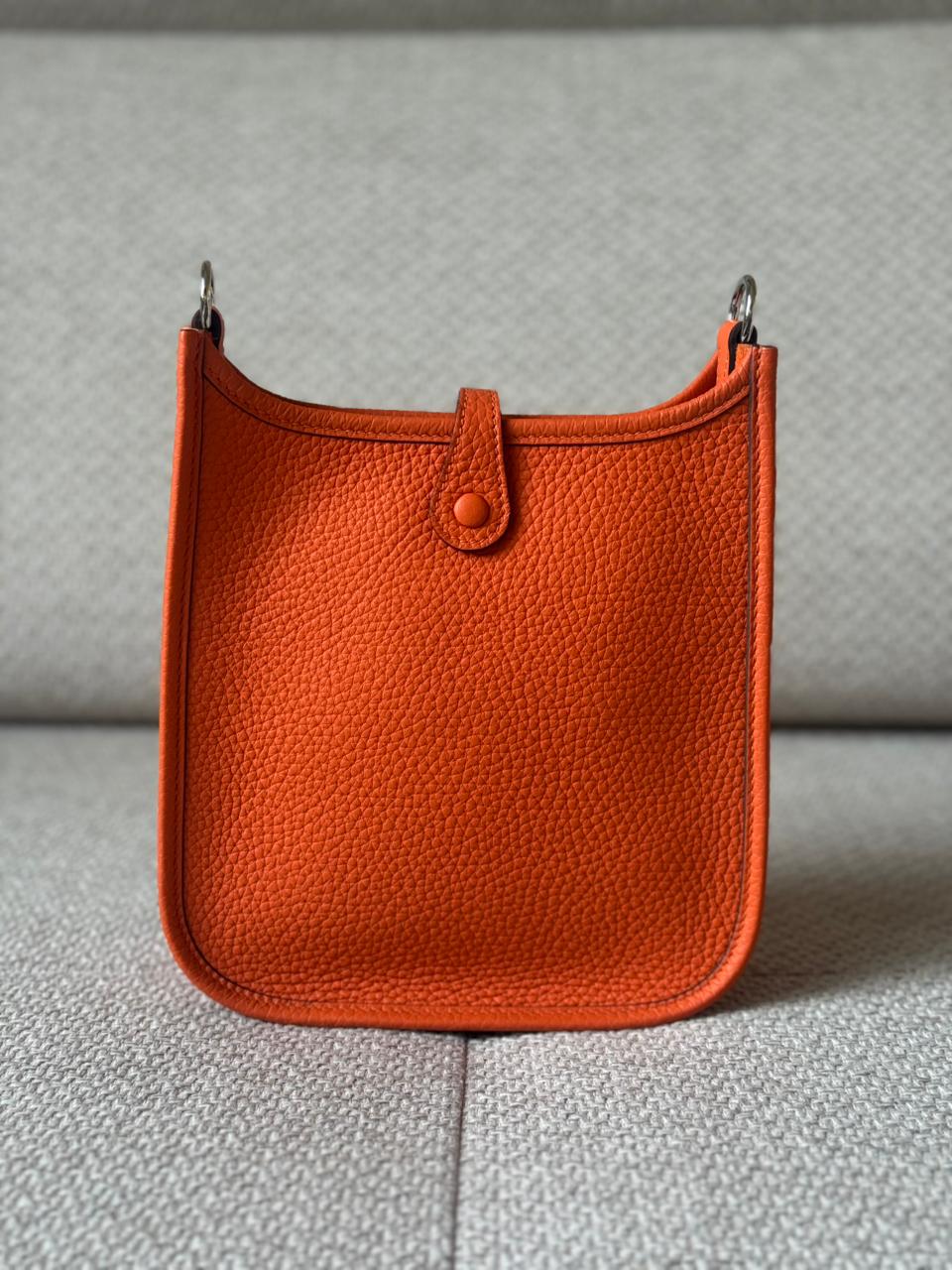 An iconic Hermès essential designed for effortless, everyday elegance. The Mini Evelyne TPM is celebrated for its lightweight structure, timeless perforated “H” motif, and practical crossbody silhouette. Finished in Hermès’ signature Orange hue with Palladium hardware, this piece is both vibrant and eternally classic — a perfect balance between casual luxury and refined craftsmanship.