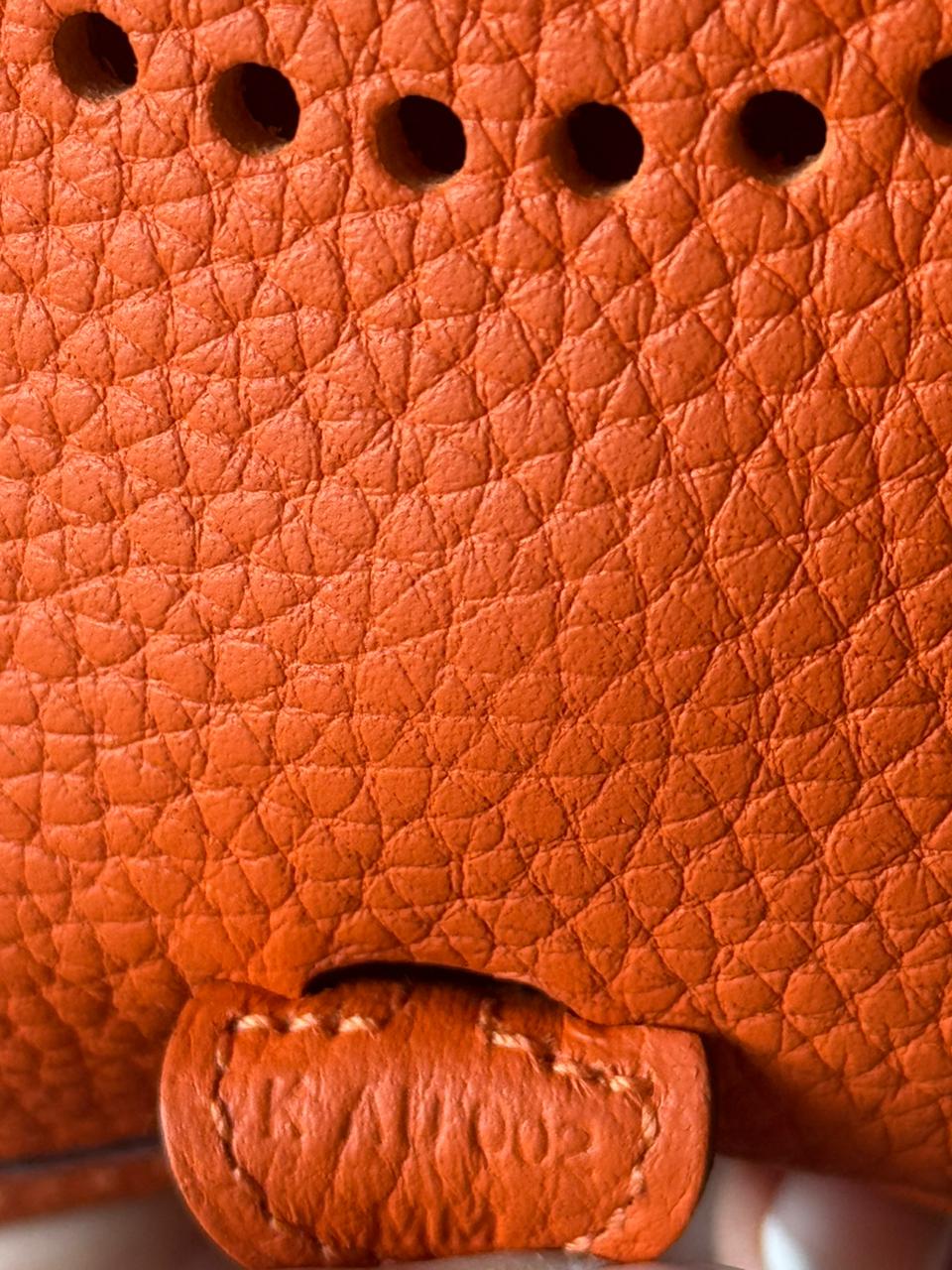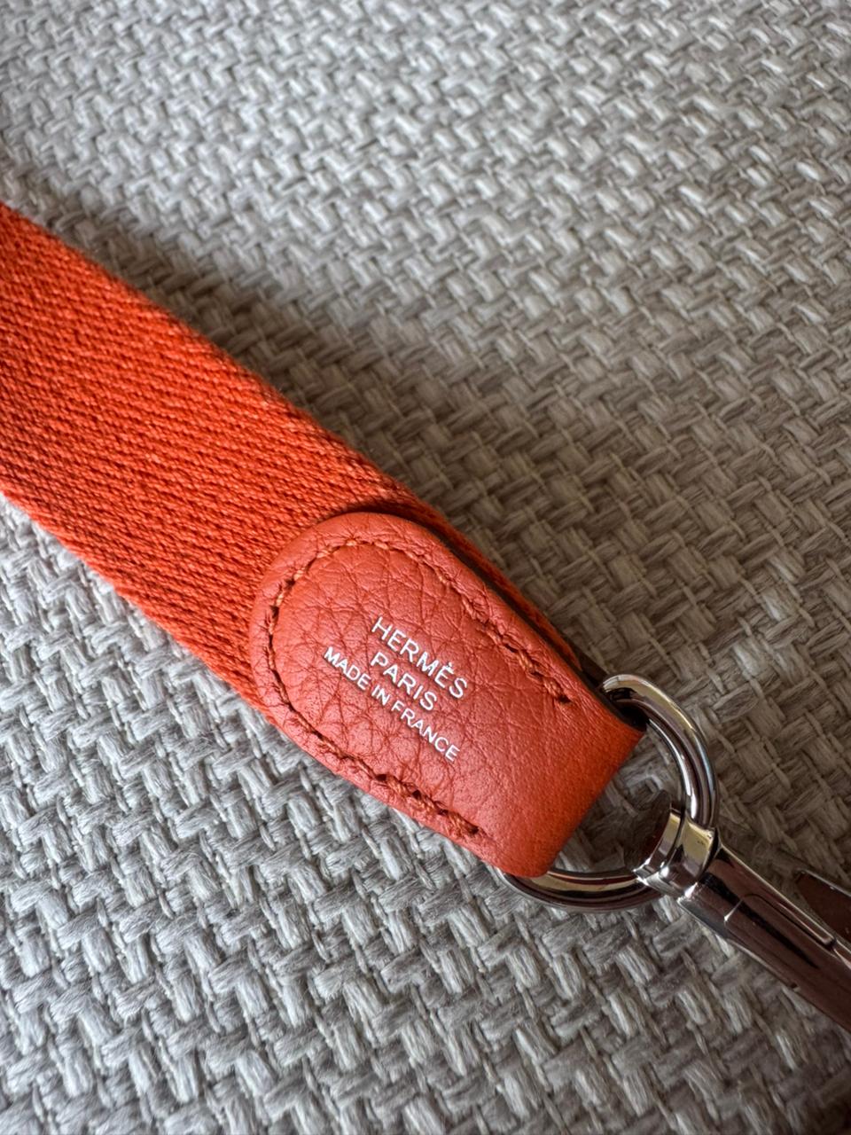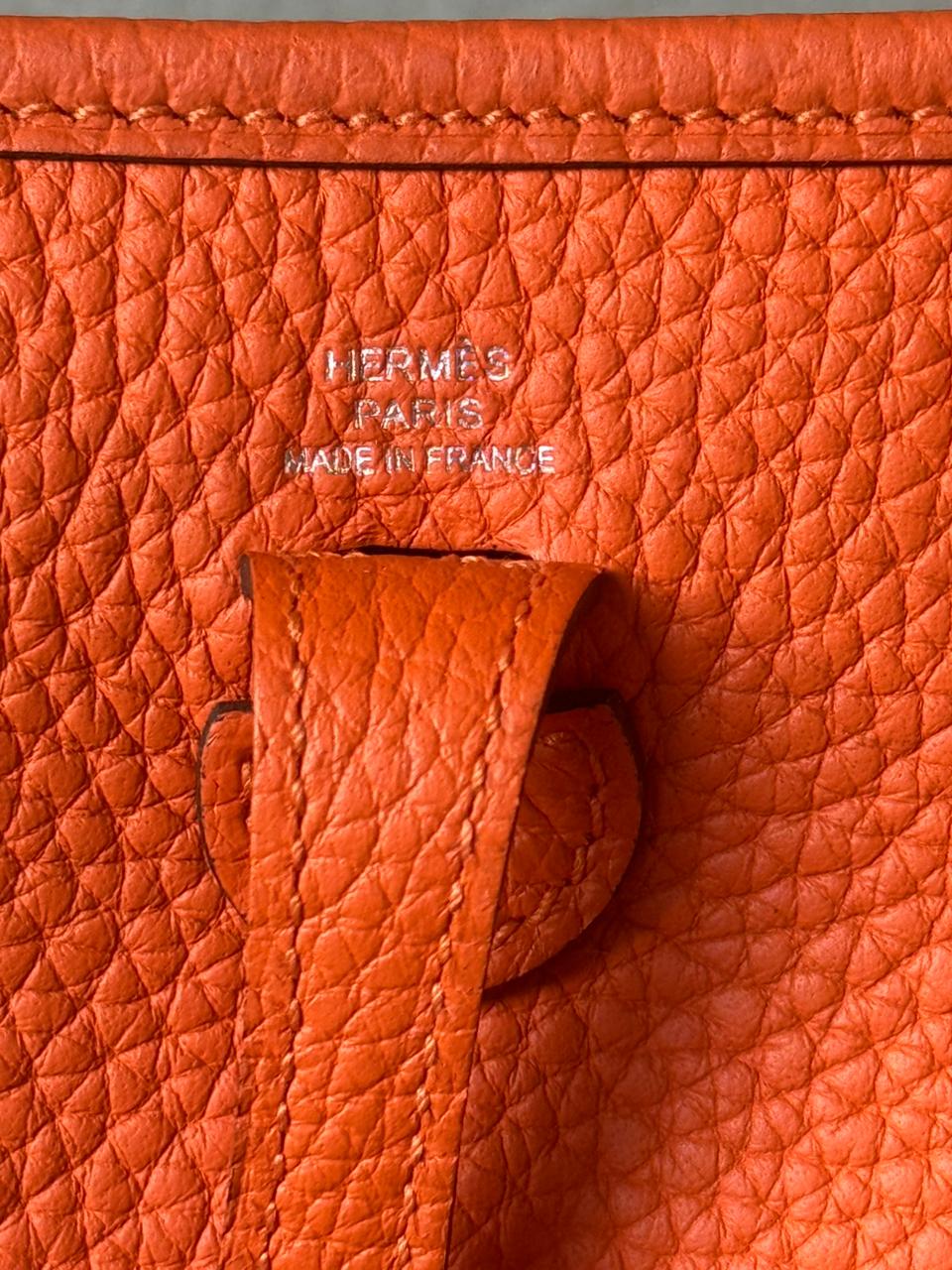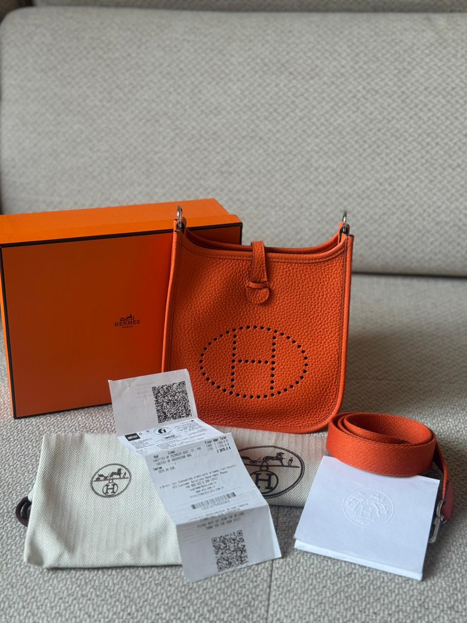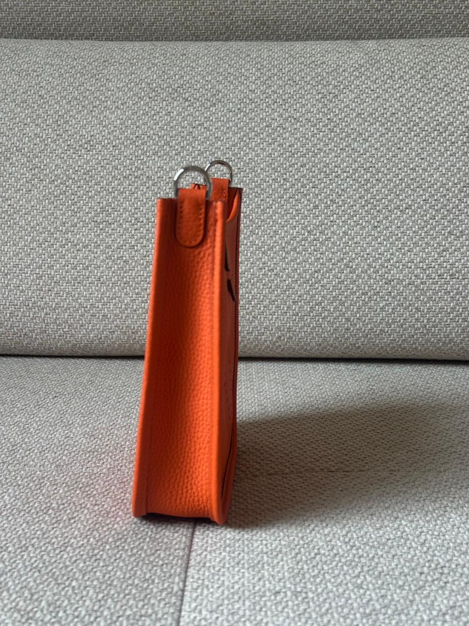 An iconic Hermès essential designed for effortless, everyday elegance. The Mini Evelyne TPM is celebrated for its lightweight structure, timeless perforated “H” motif, and practical crossbody silhouette. Finished in Hermès’ signature Orange hue with Palladium hardware, this piece is both vibrant and eternally classic — a perfect balance between casual luxury and refined craftsmanship.