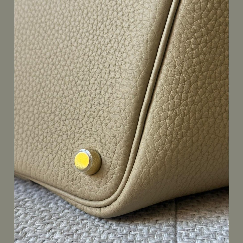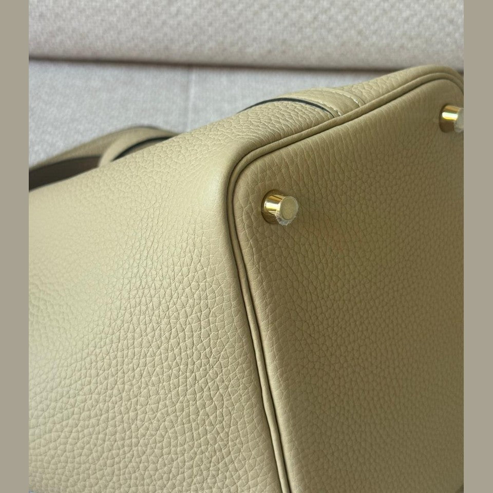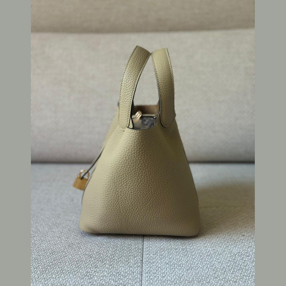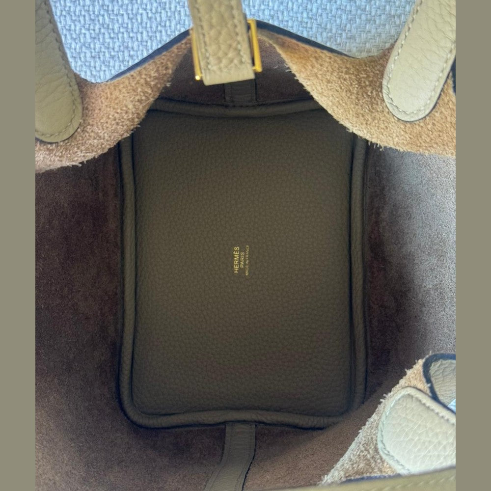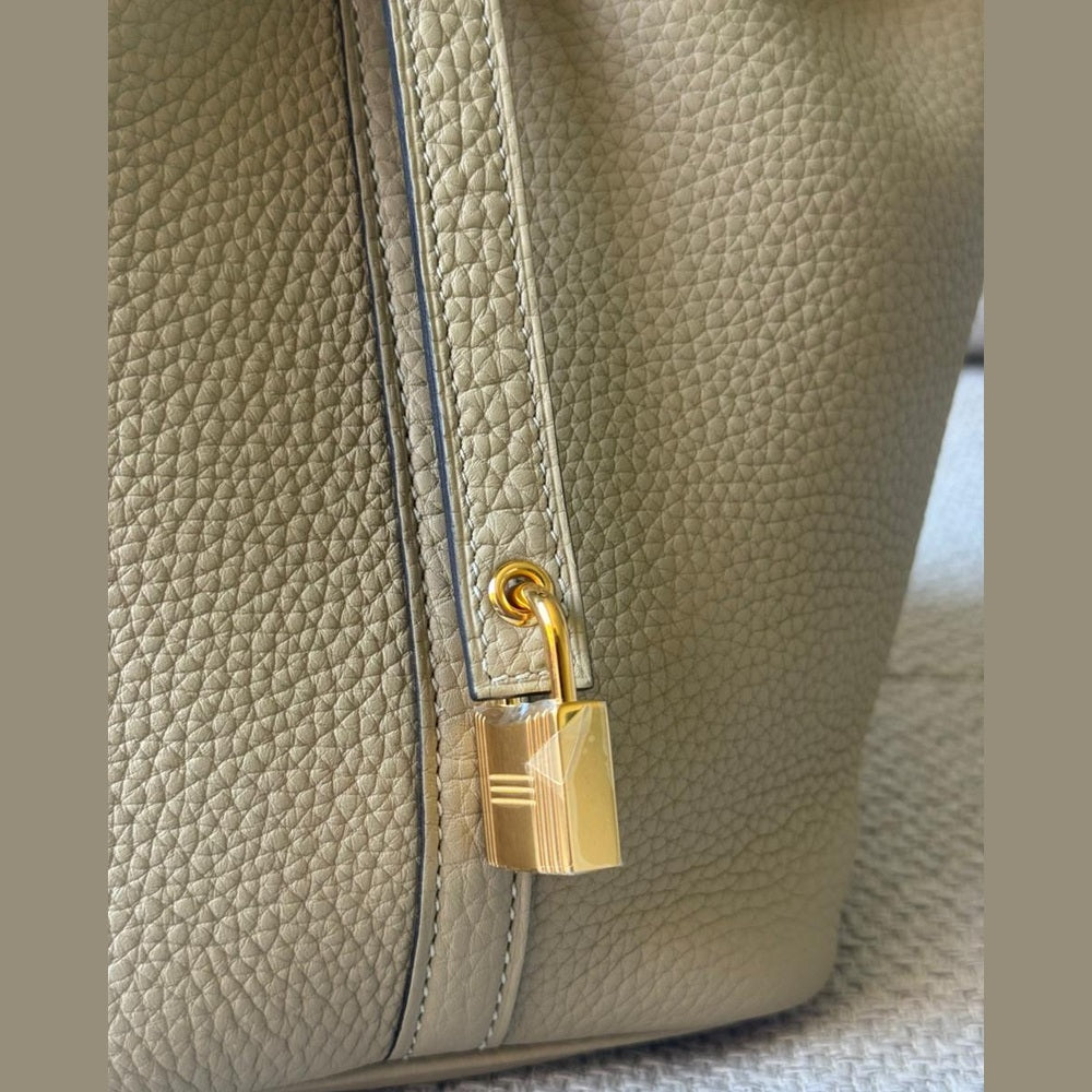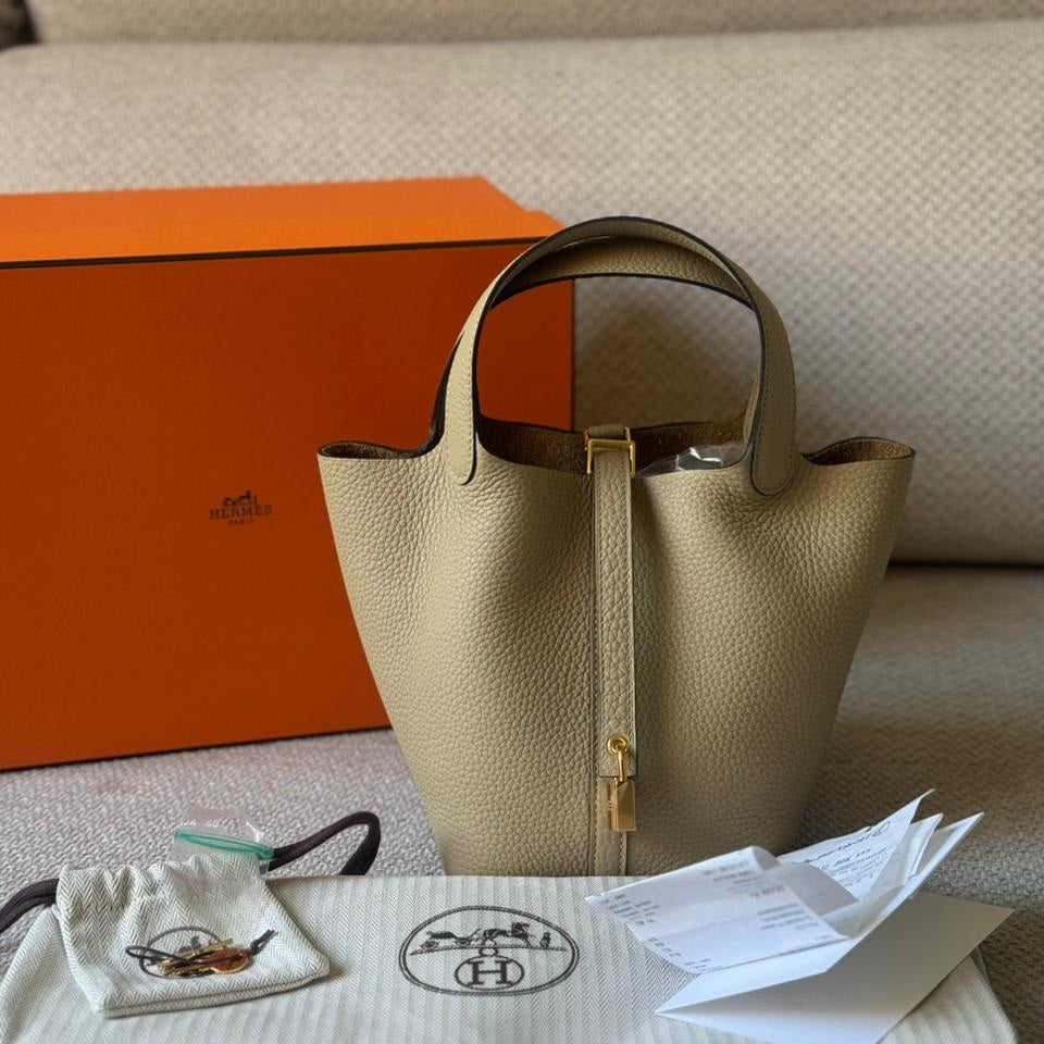 A timeless everyday Hermès piece, the Picotin 18 is loved for its effortless silhouette and understated elegance. Crafted in soft Clemence leather, the Trench shade offers a refined neutral tone that complements any wardrobe. Finished with gold hardware and the signature lock detail, this minimalist design combines practicality with quiet luxury—making it a staple for both casual and elevated looks.