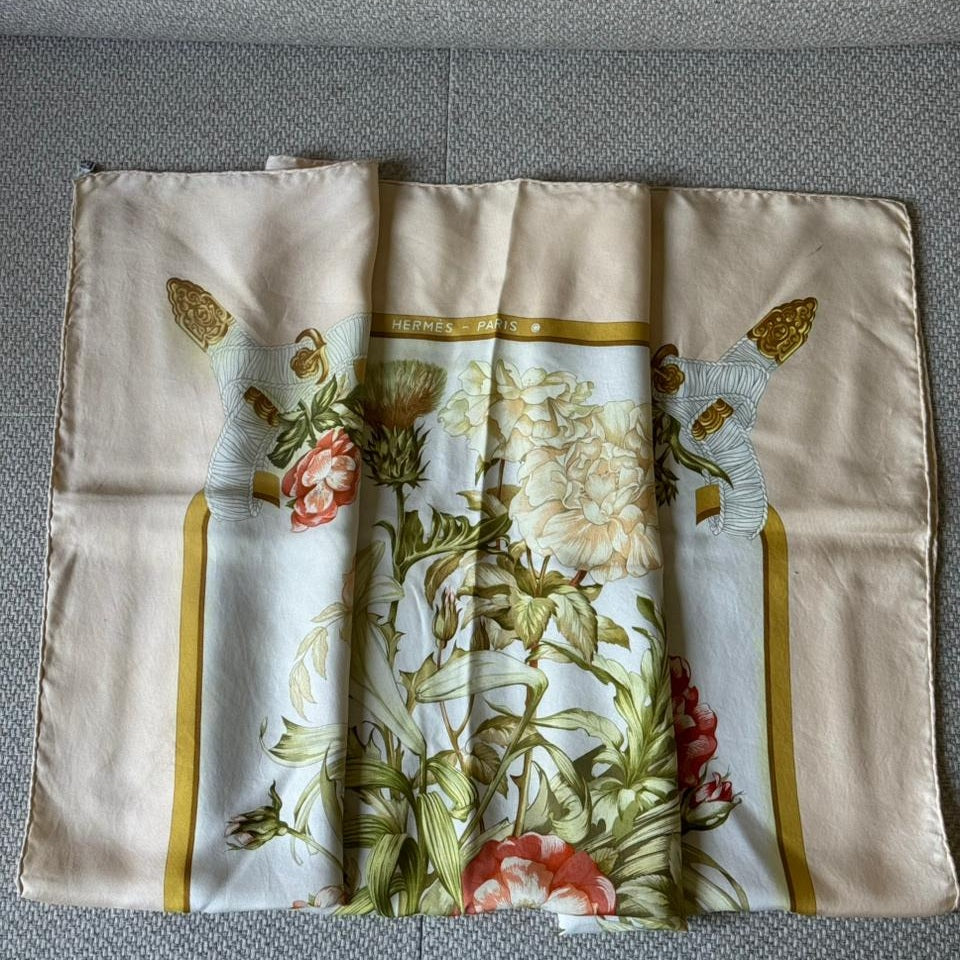 A beautifully detailed vintage Hermès carré featuring the “Regina” design, known for its regal botanical motifs and soft, romantic palette. This 90x90 silk scarf showcases the maison’s mastery of color layering and illustration, making it a timeless accessory for collectors and refined styling.