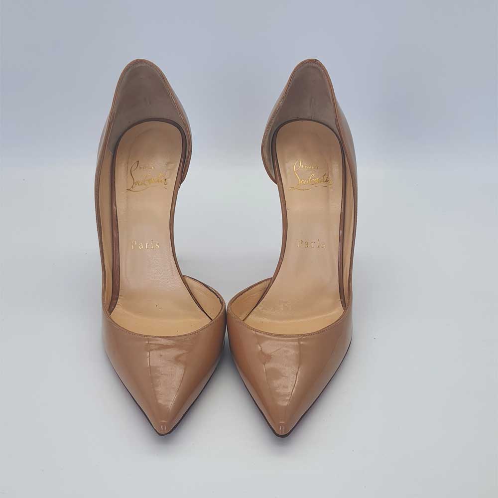 Nude Patent Leather With Low Cut Vamp And An Opening On The Side, Louboutin Signature Sole, 100mm Stiletto. Comes in Very Good condition with box included.