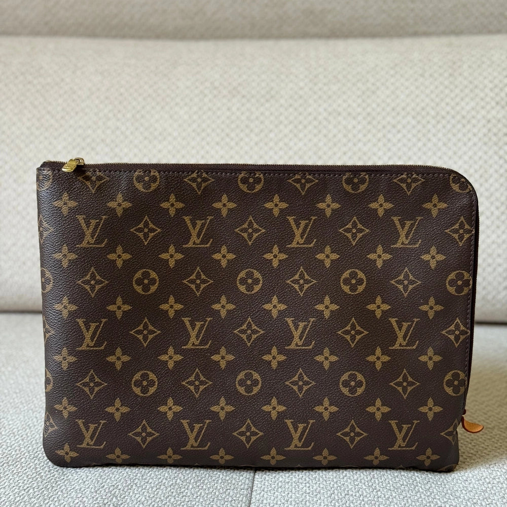 The Louis Vuitton Étui Voyage MM is a sophisticated travel companion, crafted from the brand’s iconic Monogram coated canvas with natural cowhide leather accents. Designed to hold documents, tablets, or slim essentials, this sleek pouch features a secure zip closure and a spacious interior lined with microfiber for added protection. A stylish and functional piece for business or leisure travel.