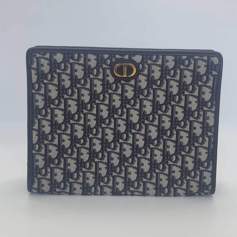 30 Montaigne Pouch In Grey & Blue Dior Oblique Jacquard, CD Signature On The Front, Zip Closure, 1 Interior Compartment, 1 Interior Patch Pocket, 1 Leather Strap, 3 Card Slots. Comes in Brand New condition with box, dust bag & cards included.