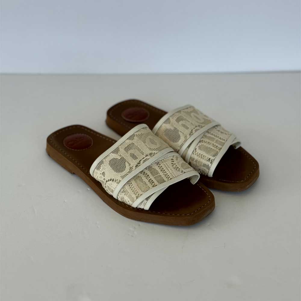 Off White Canvas And Lace With Logo Printed Slides, Wooden Beige Sole. Comes in Brand New condition with no inclusion.