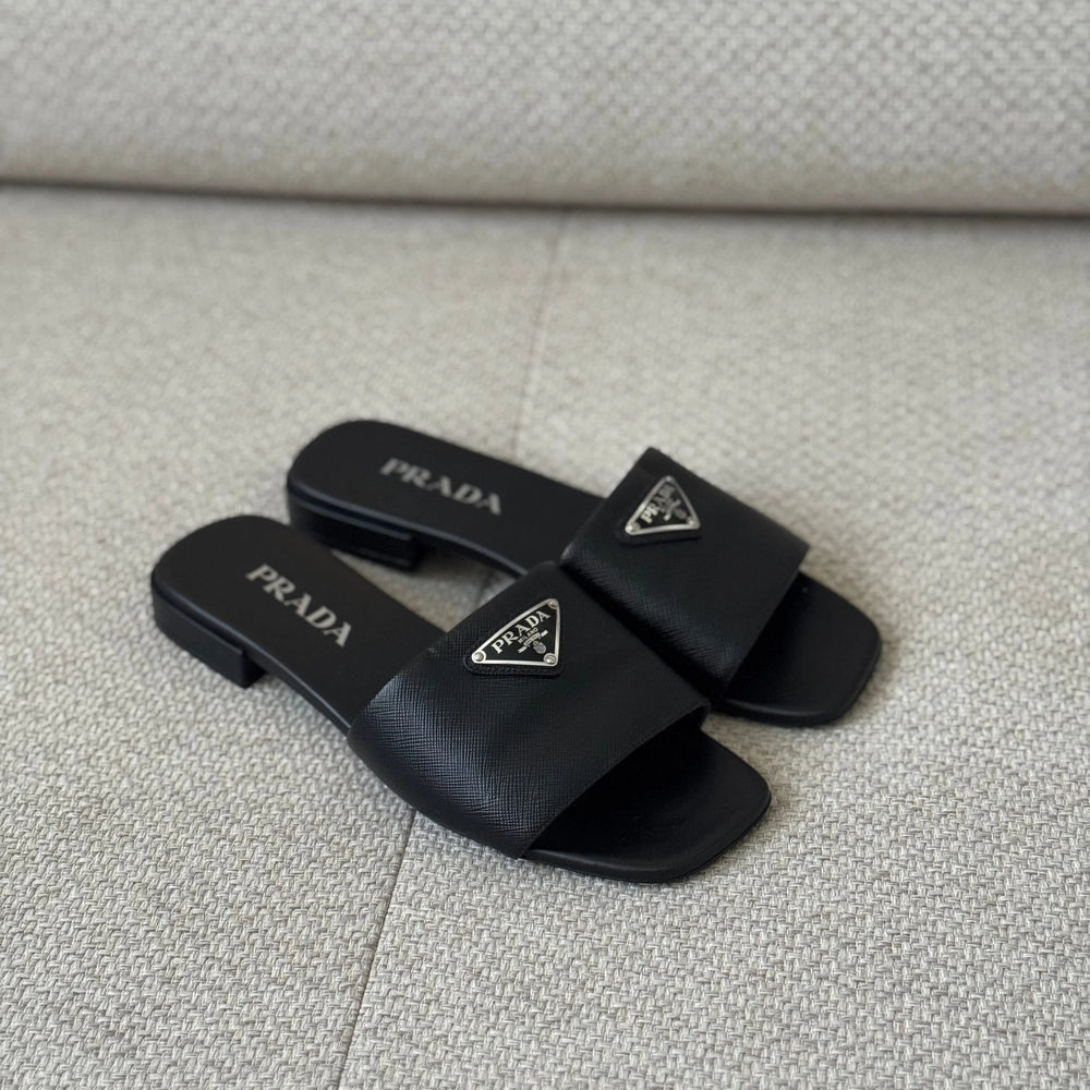 Step into timeless sophistication with these authentic Prada slides, expertly crafted in Italy from the house’s signature black Saffiano leather. The sleek, minimalist silhouette features a wide strap accented by the iconic enameled metal triangle logo, instantly elevating any casual ensemble.