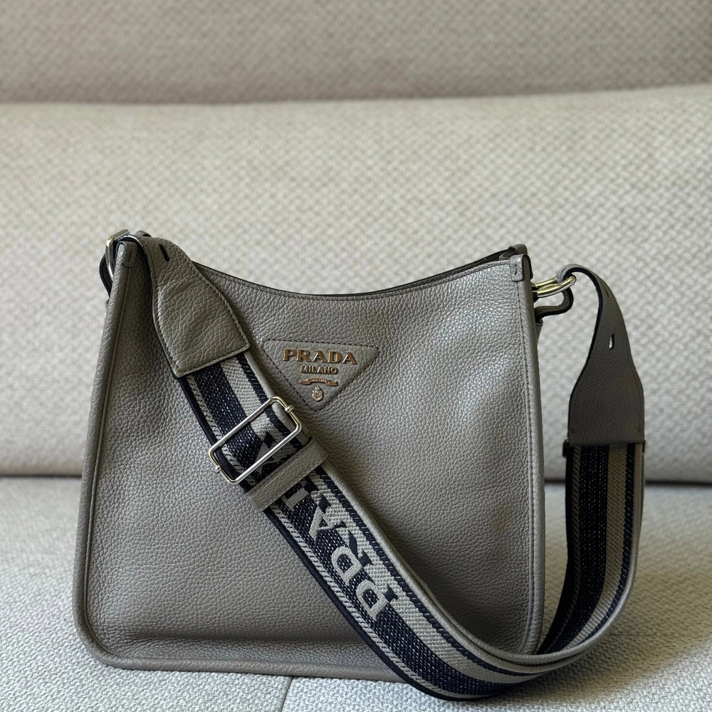 Chic and understated, this Prada hobo shoulder bag is crafted from supple grey leather and features the iconic enamel triangle logo on the front — a hallmark of timeless Italian luxury. The curved, minimalist silhouette is elevated with a contrasting black canvas shoulder strap, giving it a modern, sporty edge. Designed for effortless everyday use, the spacious interior is secured with a magnetic snap closure, making it easy to access your essentials on the go. The structure and comfortable strap make this bag perfect for both casual outings and polished daywear.