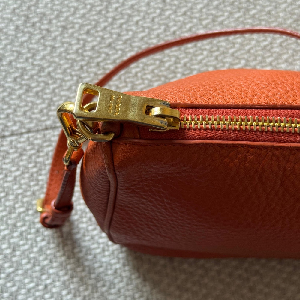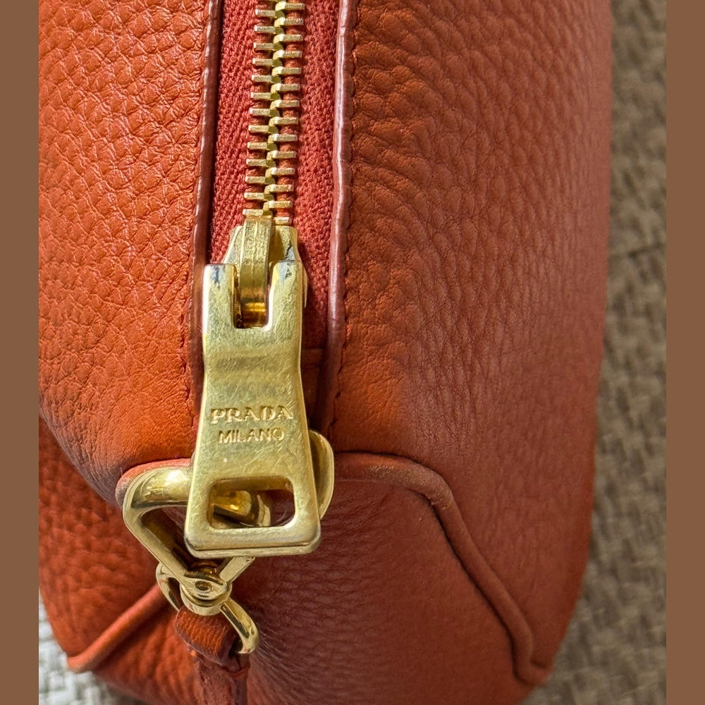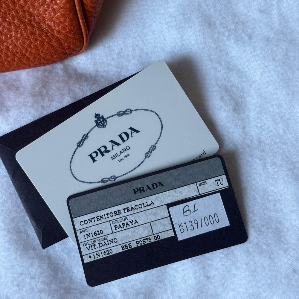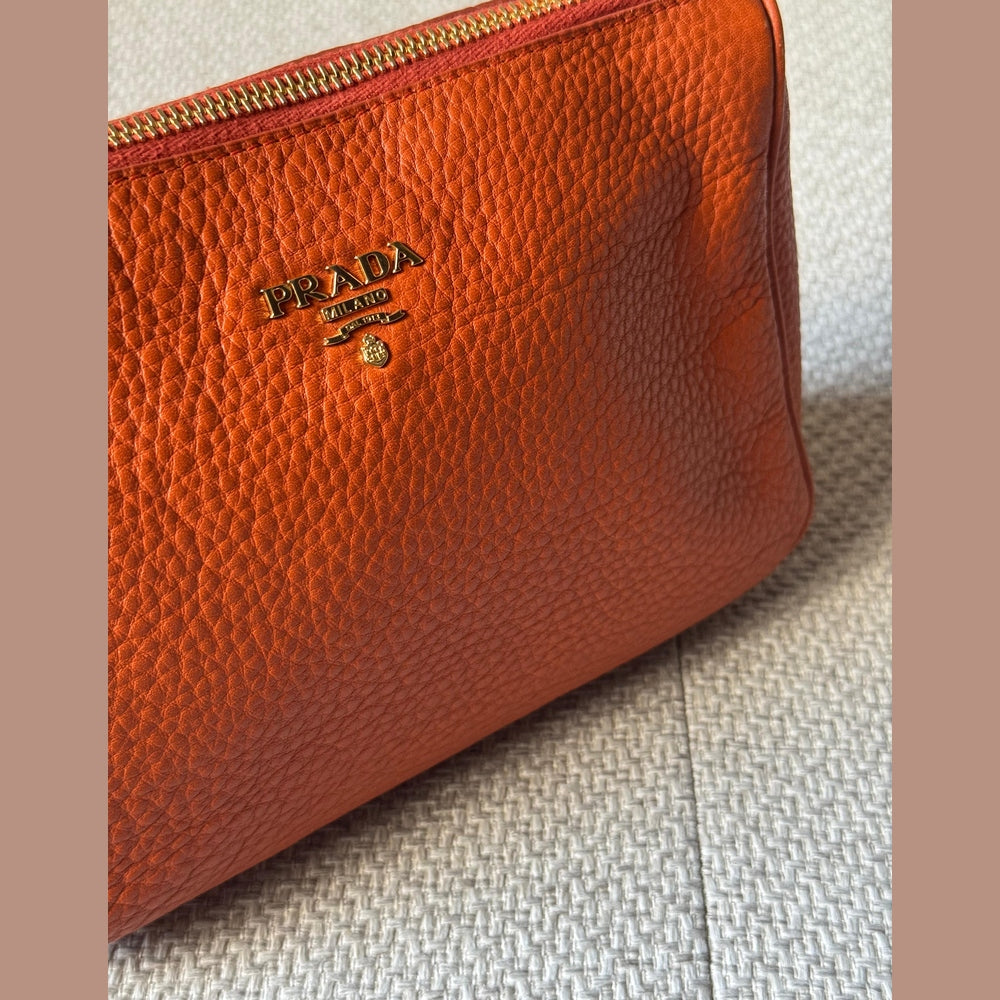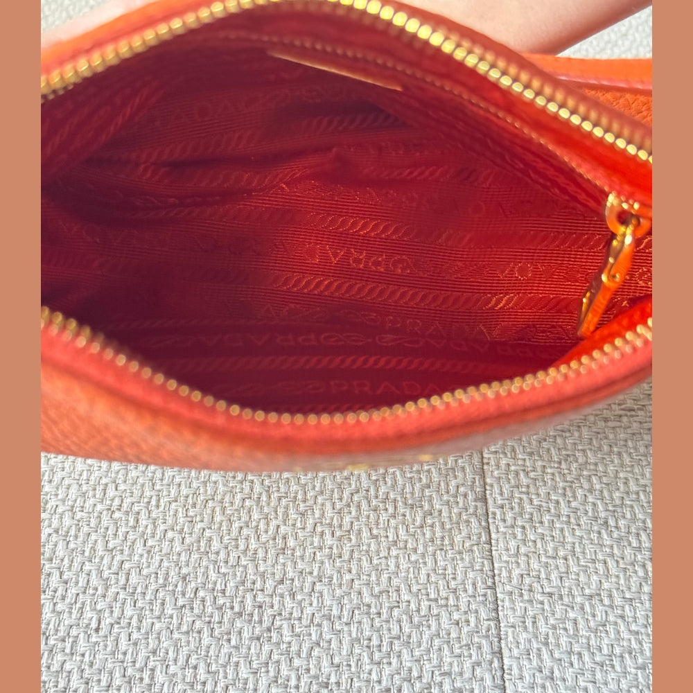 Crafted from Prada’s signature Vitello Daino grained leather, this pochette comes in a rich orange tone that adds an elegant pop of color to any outfit. Its soft, textured finish gives it a luxurious feel while maintaining the relaxed, effortless charm Prada is known for.