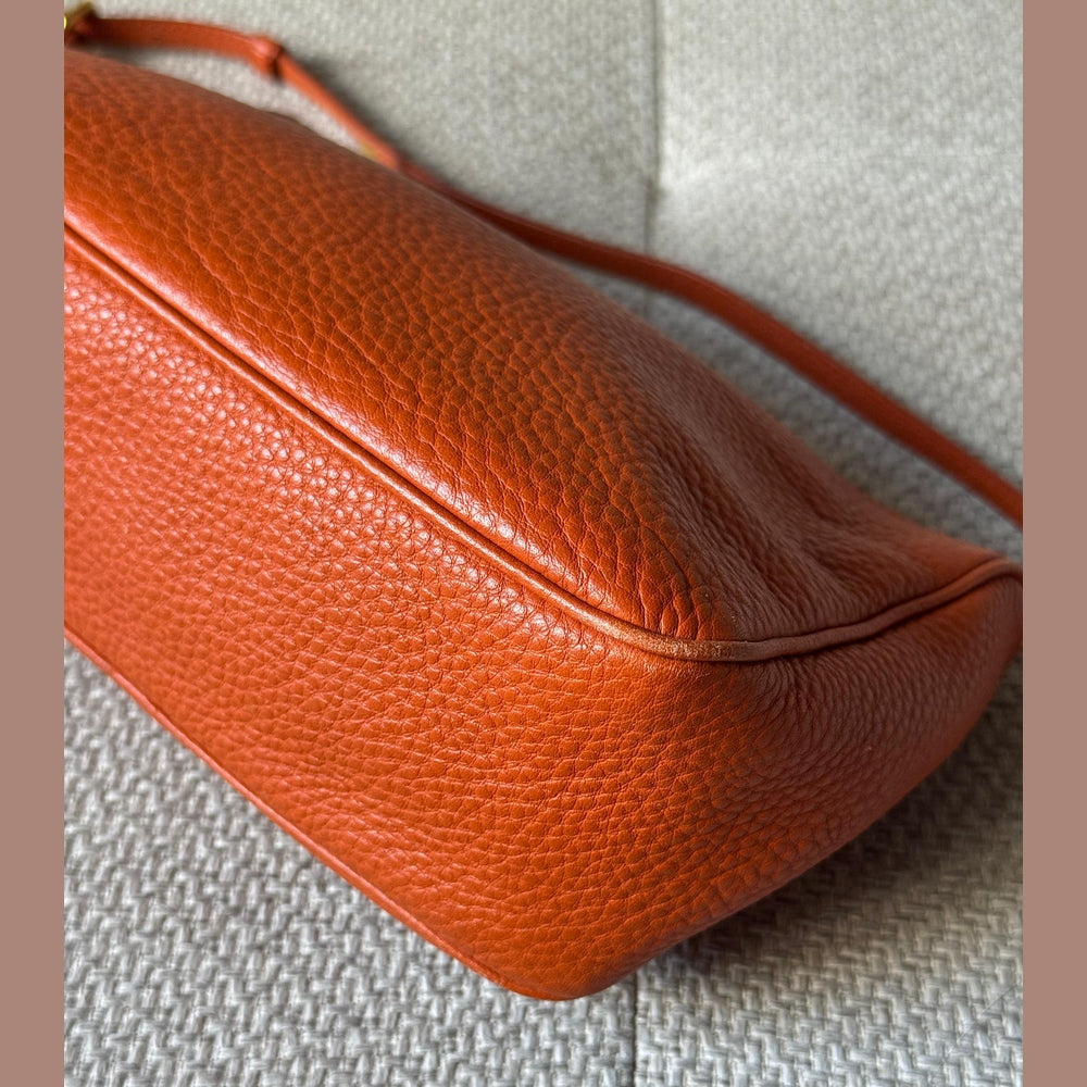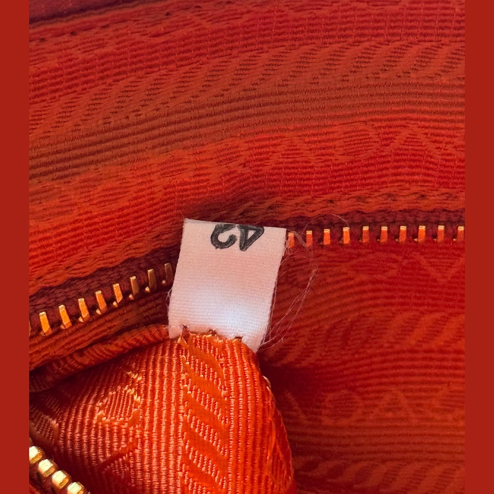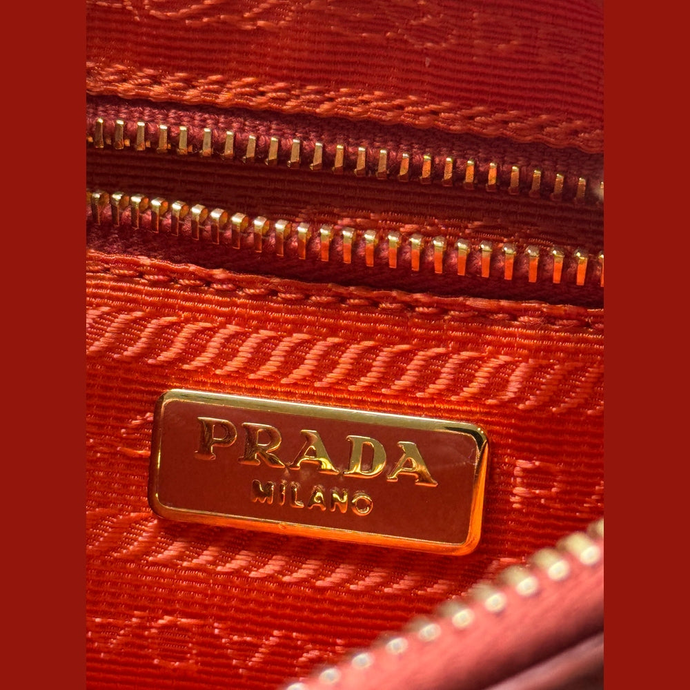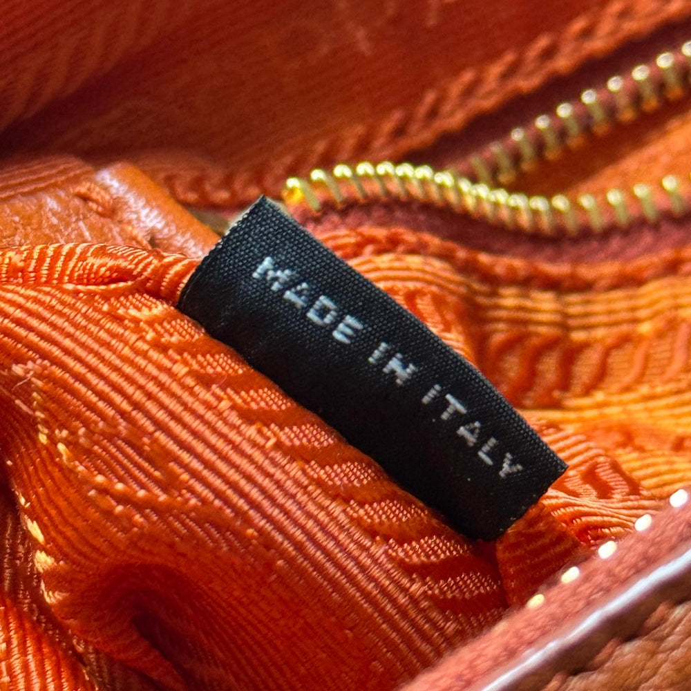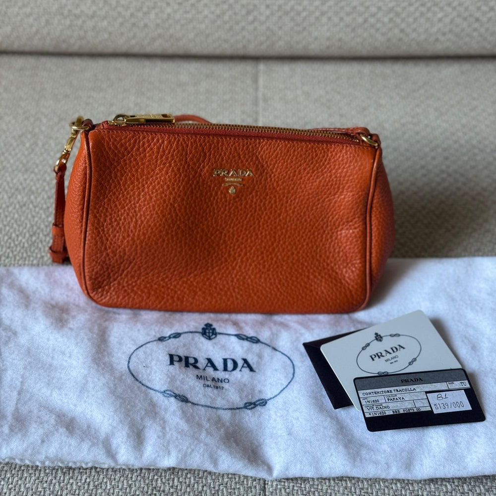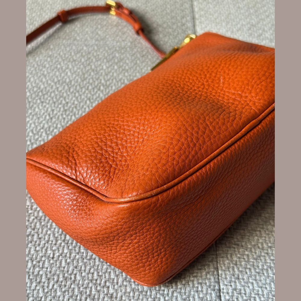 Crafted from Prada’s signature Vitello Daino grained leather, this pochette comes in a rich orange tone that adds an elegant pop of color to any outfit. Its soft, textured finish gives it a luxurious feel while maintaining the relaxed, effortless charm Prada is known for.