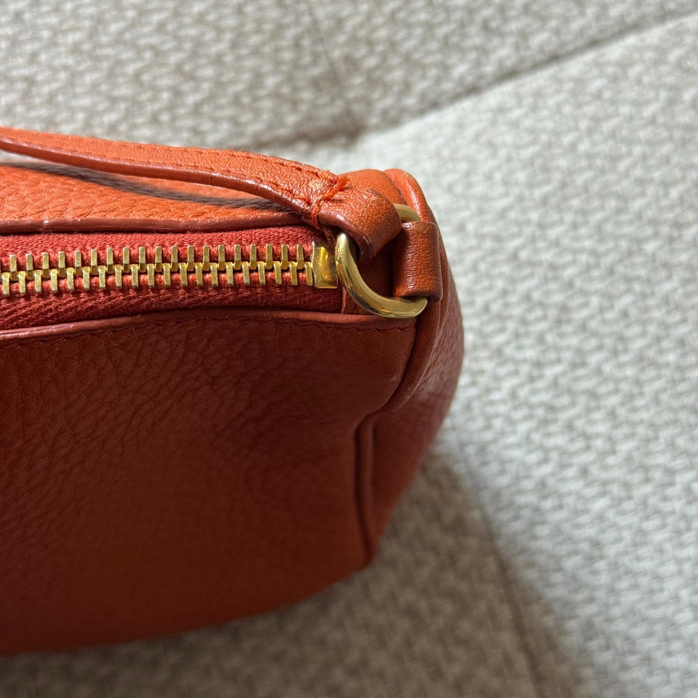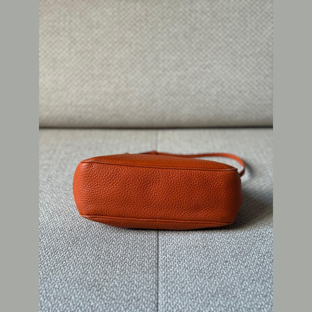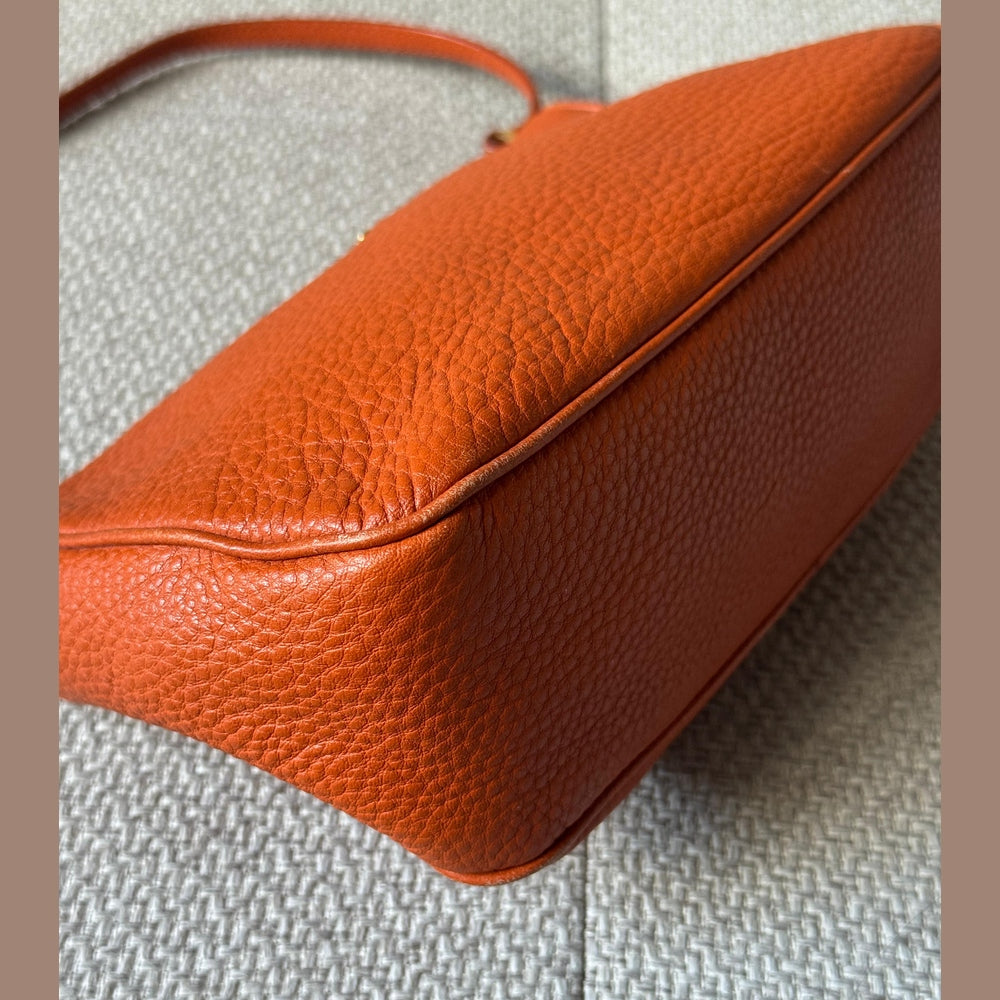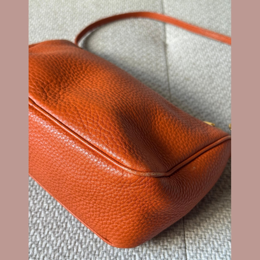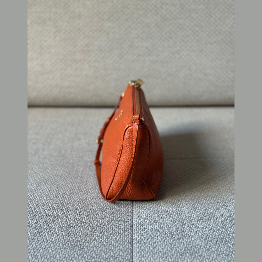 Crafted from Prada’s signature Vitello Daino grained leather, this pochette comes in a rich orange tone that adds an elegant pop of color to any outfit. Its soft, textured finish gives it a luxurious feel while maintaining the relaxed, effortless charm Prada is known for.