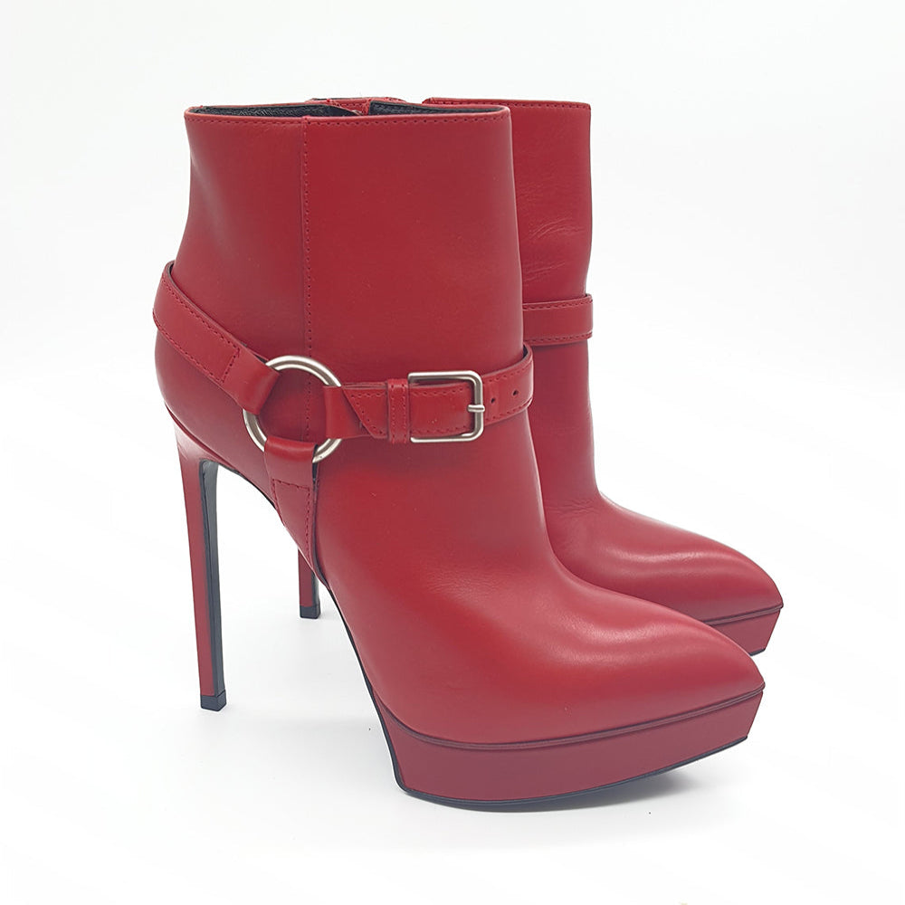 Red Leather Ankle Pointed Front Toe Booties With Front Wedge, Red Leather Strap With Silver Buckle And Silver Side Zipper. 13cm Back Heel, 3cm Front Heel. Comes in Like New condition with no inclusion.