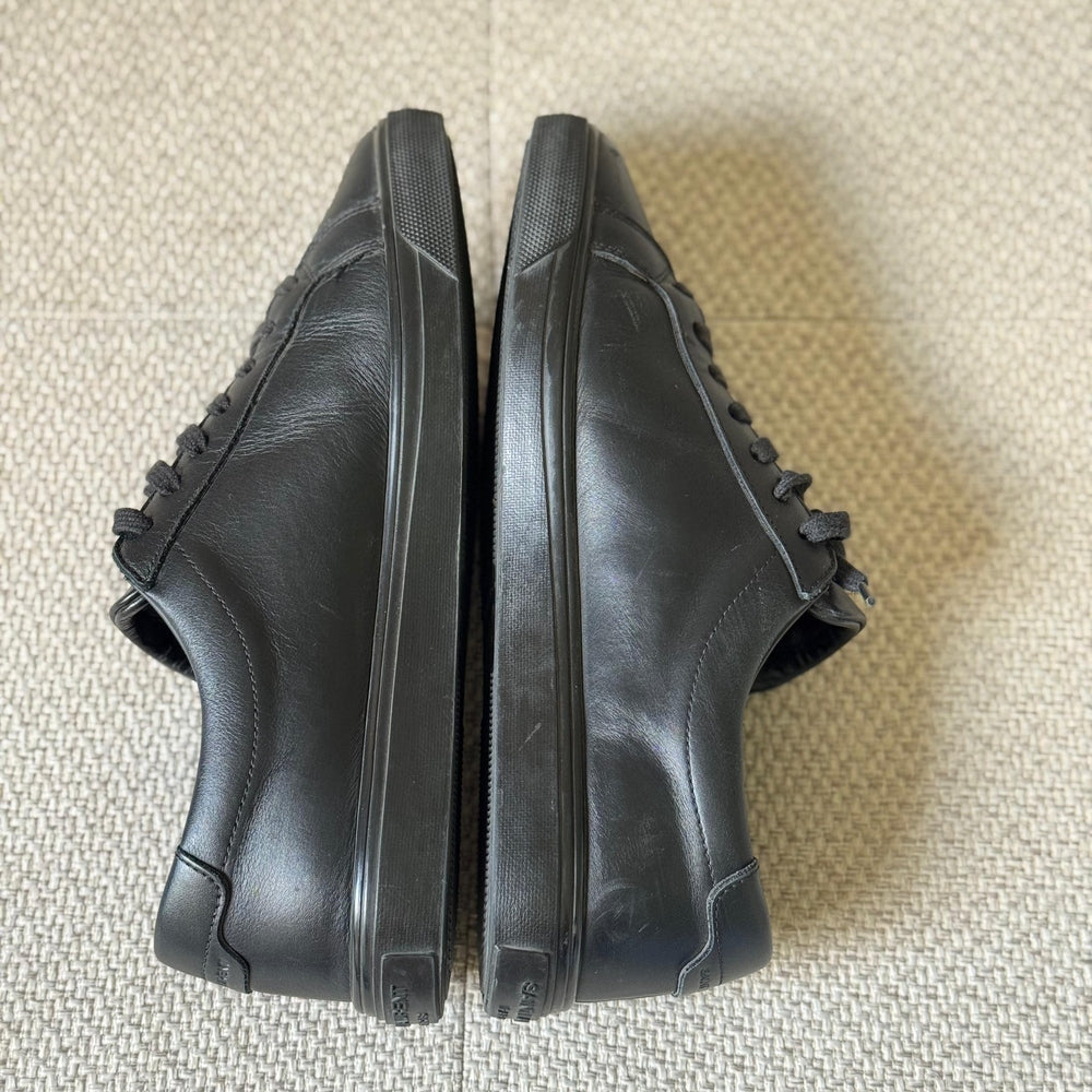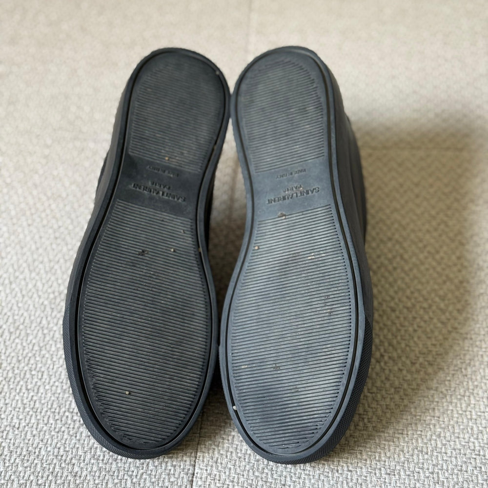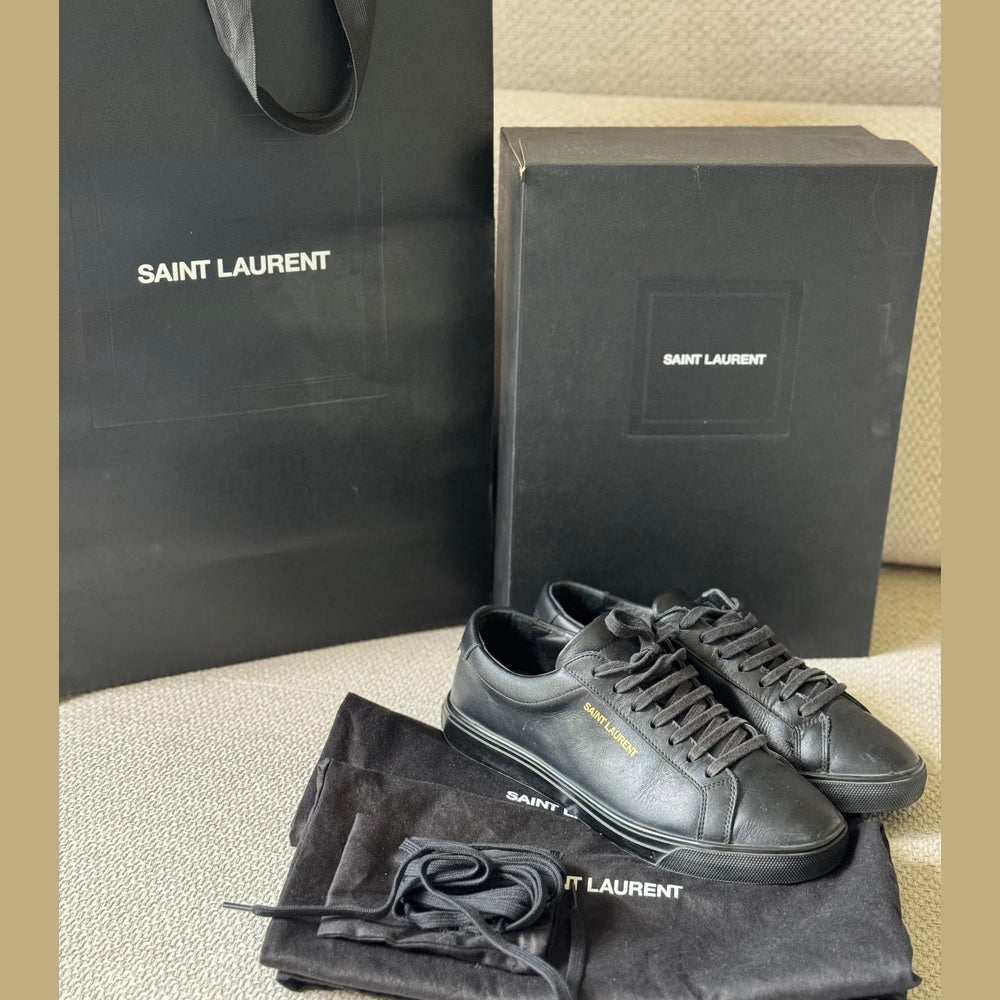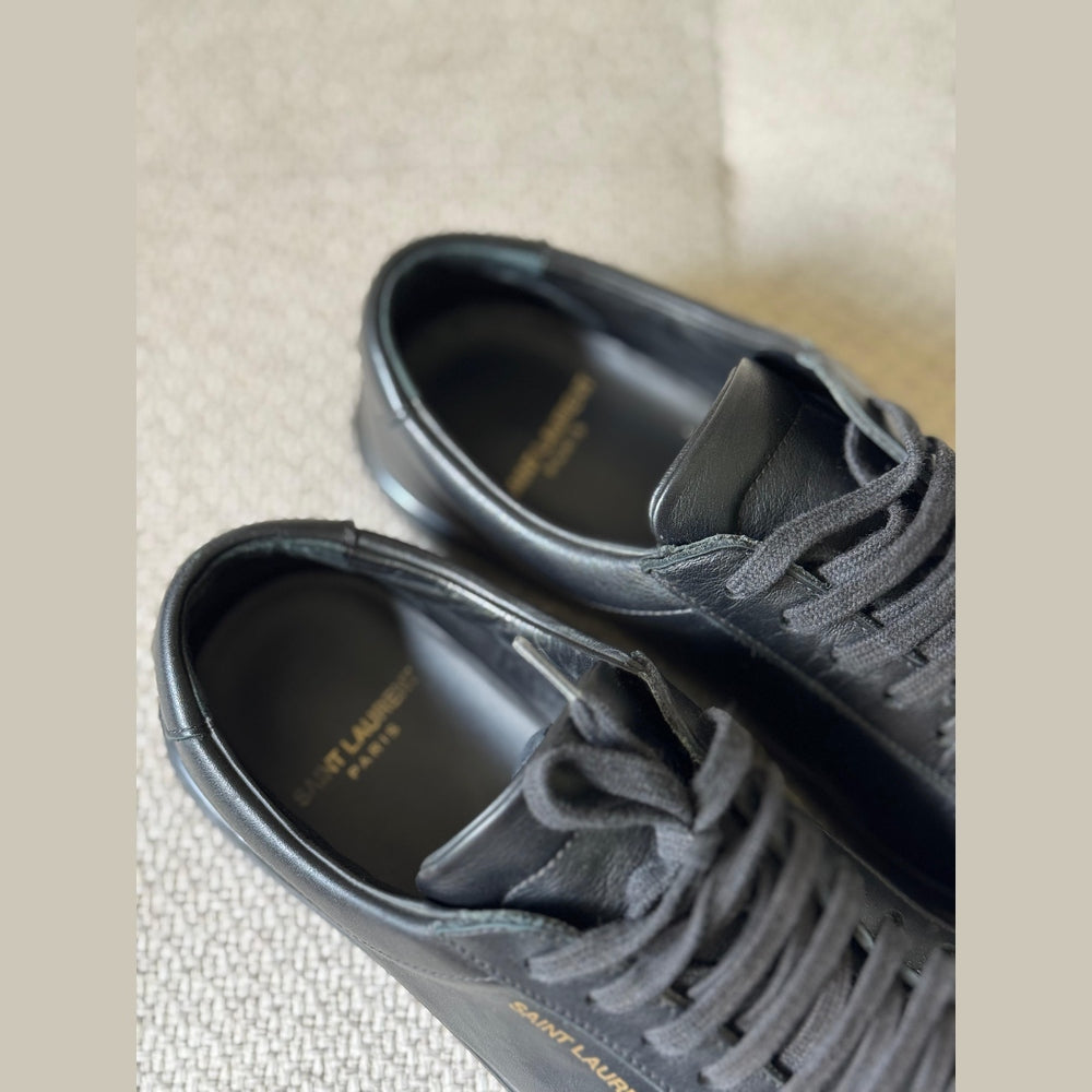 Crafted from smooth black leather, the Saint Laurent Andy Sneakers embody understated luxury and modern minimalism. This low-top silhouette features tonal laces, a sleek round toe, and the signature SAINT LAURENT logo stamped in gold at the side for a refined finish. The design rests on a durable rubber sole that ensures comfort and versatility, making them perfect for everyday wear or casual chic looks.