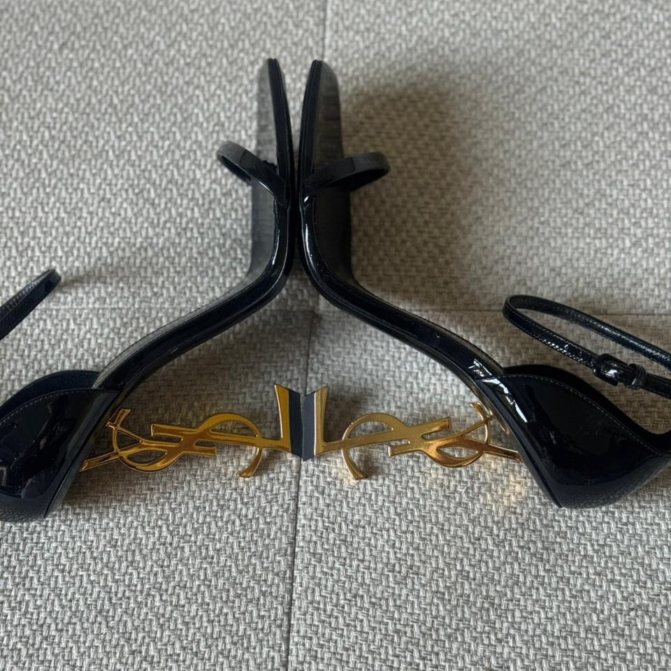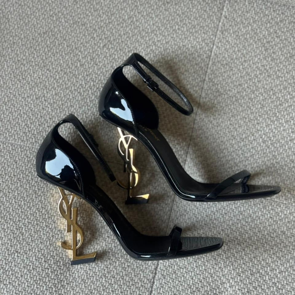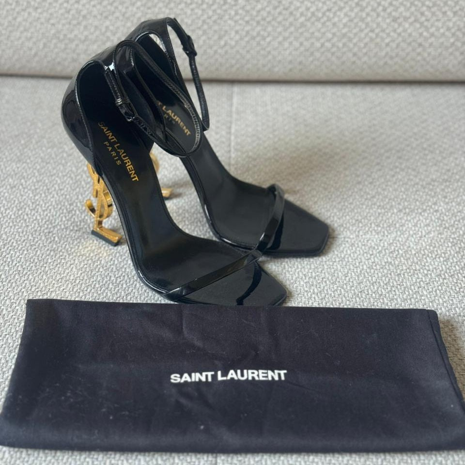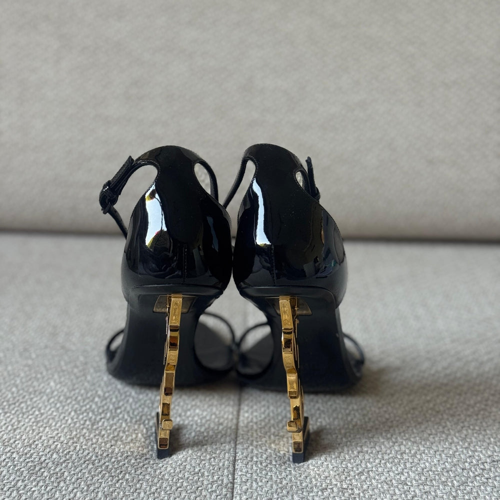 An iconic statement from Saint Laurent, the Opyum sandals are instantly recognizable for their sculptural YSL logo heel in gold-tone metal. Crafted in sleek black patent leather, they combine bold design with refined elegance. This striking silhouette elevates any evening or occasion look, making it a standout piece in any luxury collection.