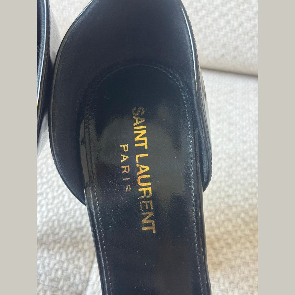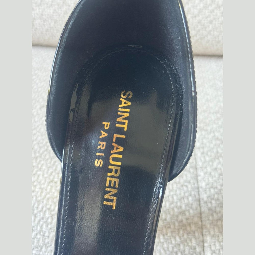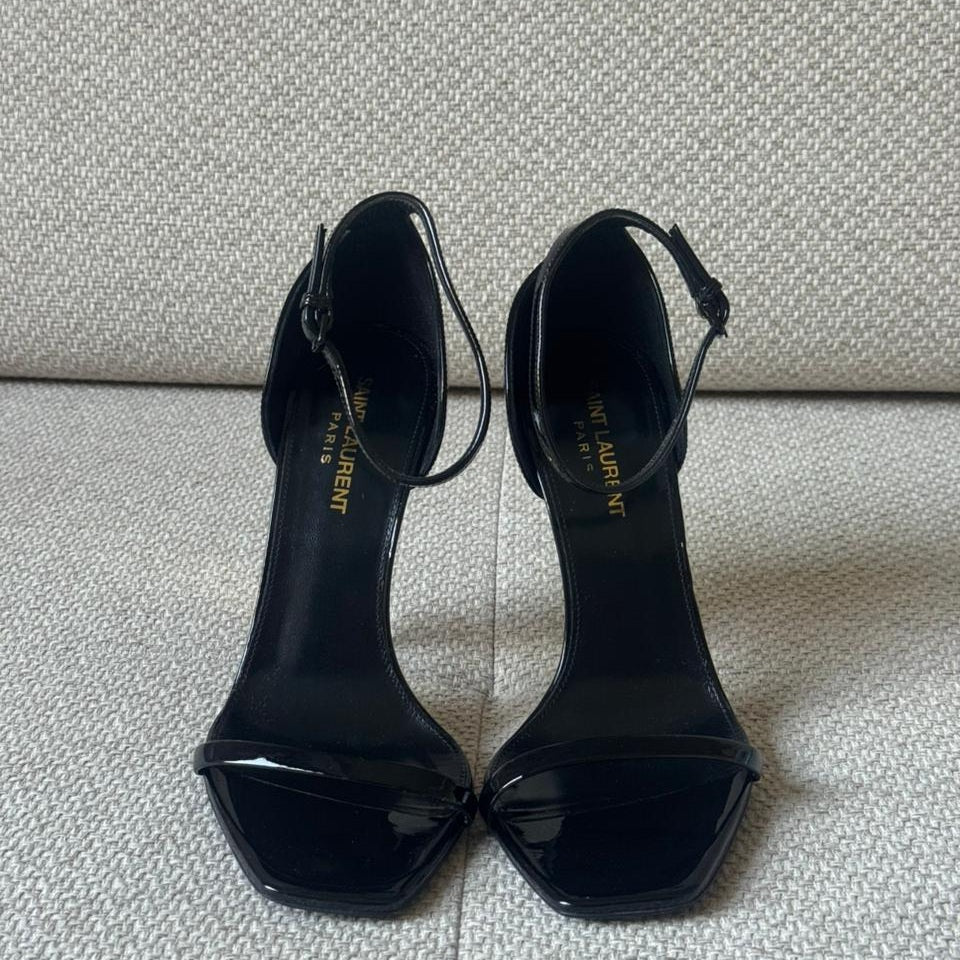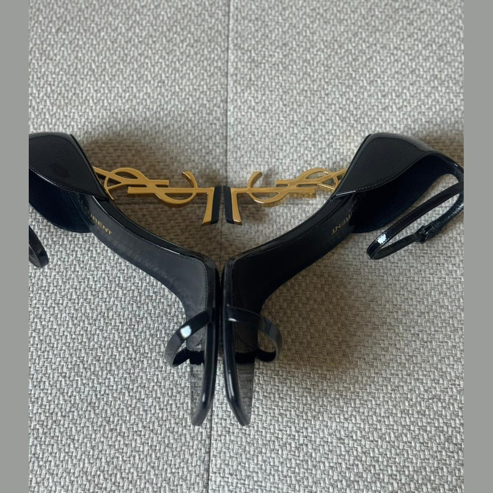 An iconic statement from Saint Laurent, the Opyum sandals are instantly recognizable for their sculptural YSL logo heel in gold-tone metal. Crafted in sleek black patent leather, they combine bold design with refined elegance. This striking silhouette elevates any evening or occasion look, making it a standout piece in any luxury collection.