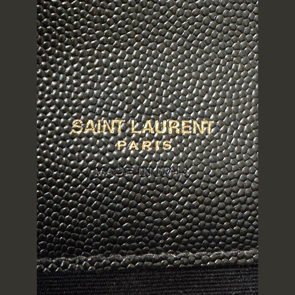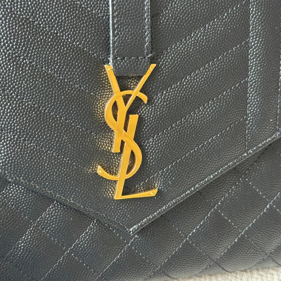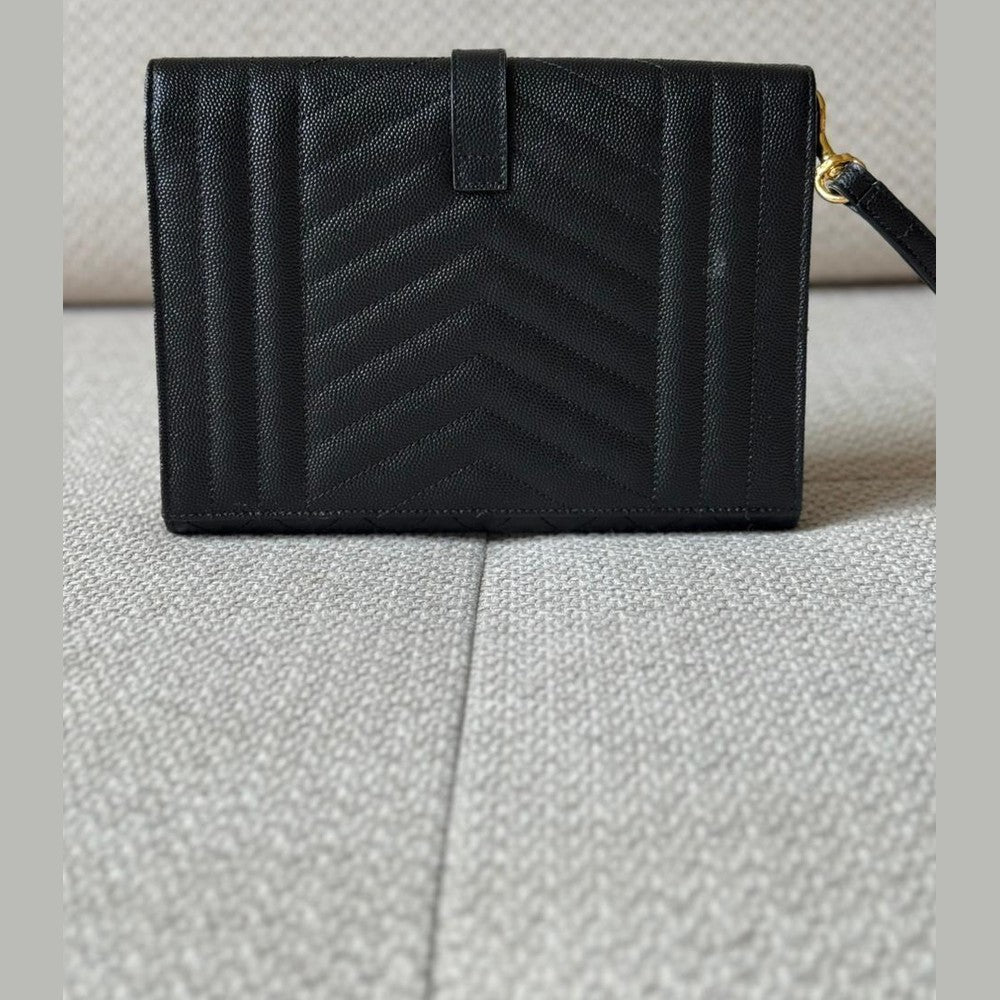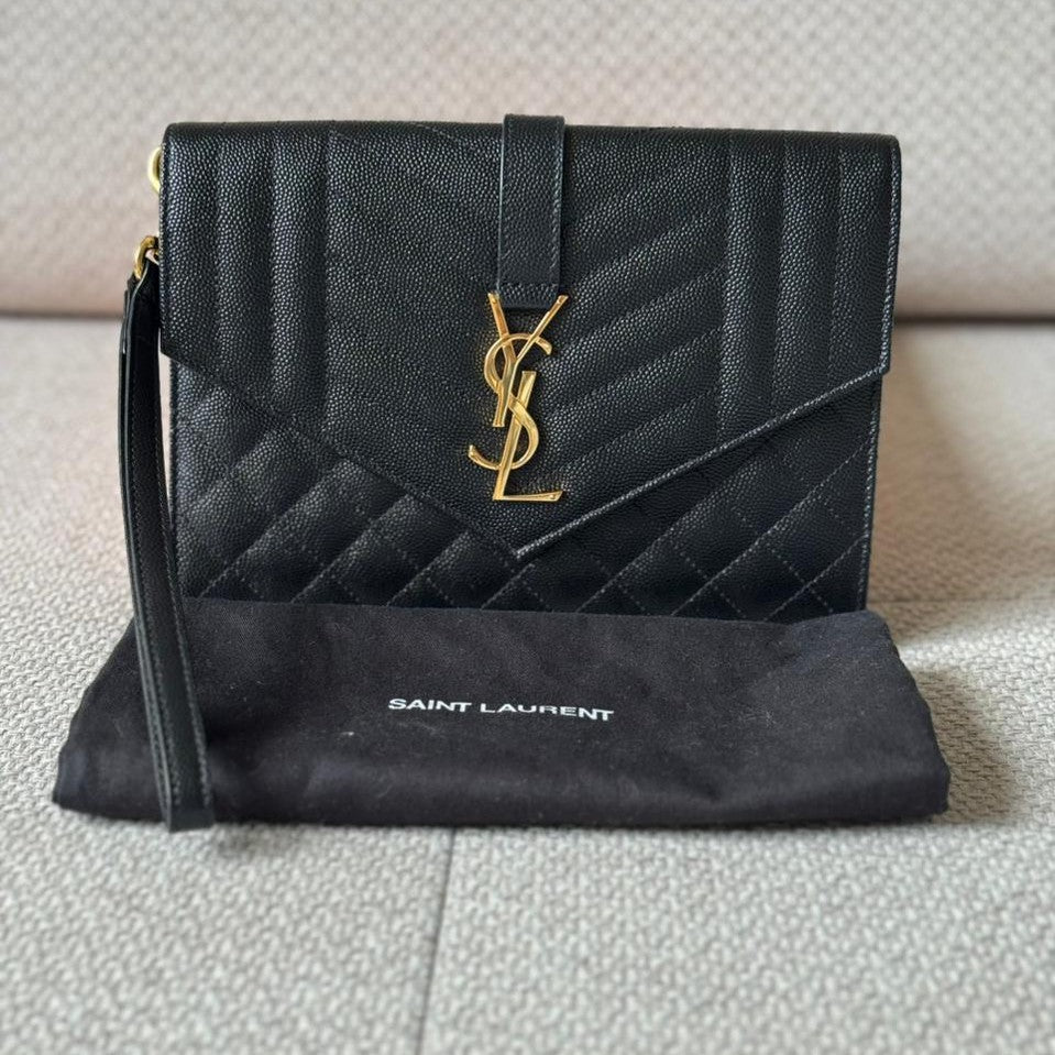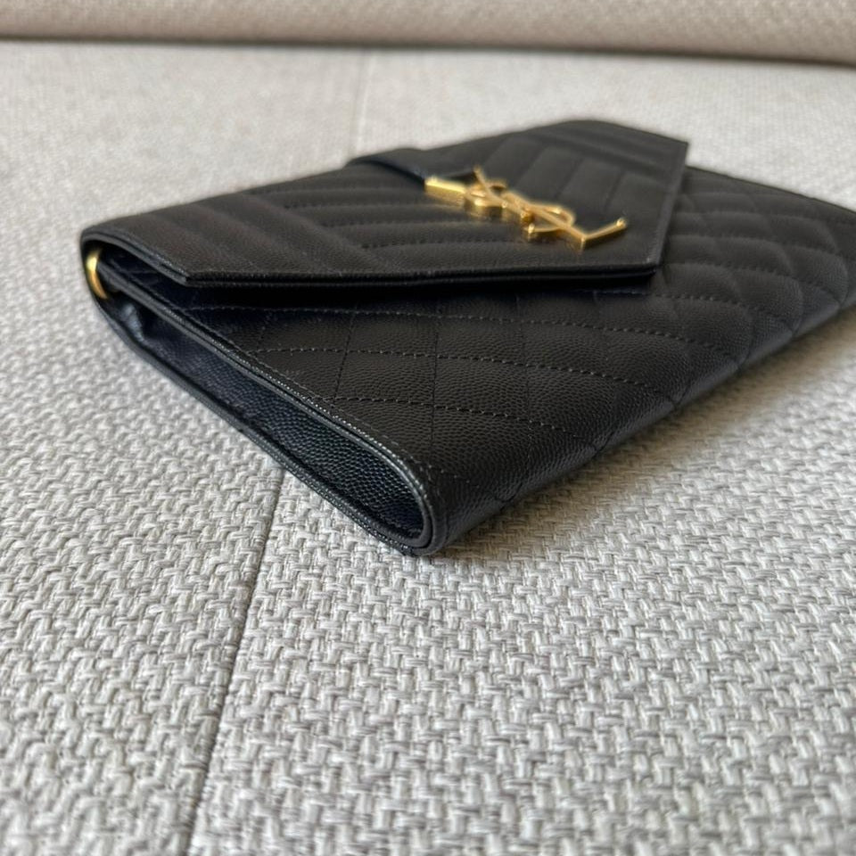 A timeless expression of Saint Laurent’s signature elegance, this Envelope clutch embodies refined sophistication with its iconic matelassé chevron quilting and sleek structured silhouette. Crafted in luxurious textured leather and finished with the classic YSL monogram in gold-tone hardware, it is a versatile piece that transitions effortlessly from day to evening. Designed to be carried as a clutch or worn with its detachable strap, it offers both practicality and understated luxury.