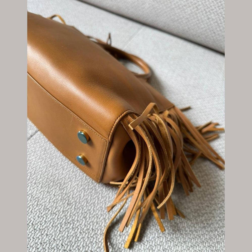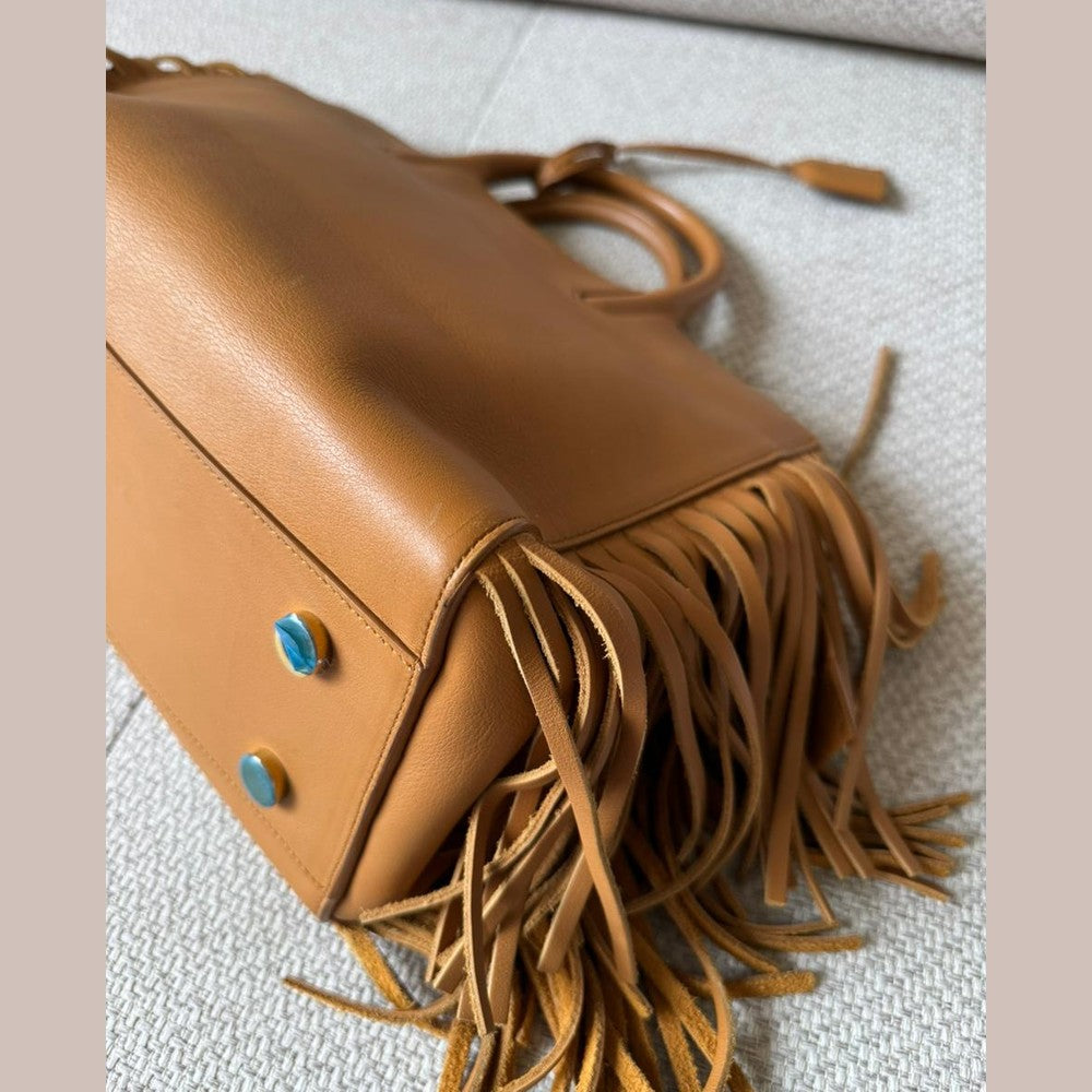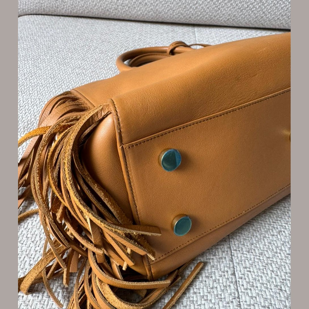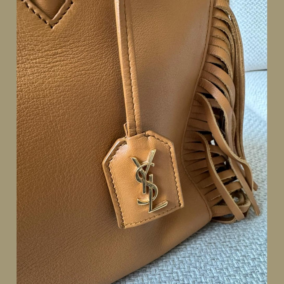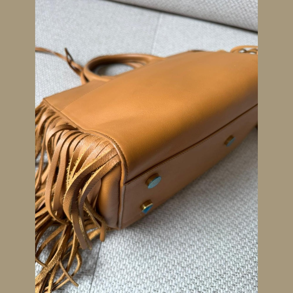 A statement piece that blends Saint Laurent’s understated elegance with a bold bohemian edge, the Rive Gauche Fringe Satchel is crafted in smooth calfskin leather in a rich camel tone. The clean, structured silhouette is elevated by dramatic side fringe detailing, creating movement while maintaining a refined, timeless aesthetic. Finished with subtle Saint Laurent branding and gold-tone accents, this piece offers both practicality and distinctive style.