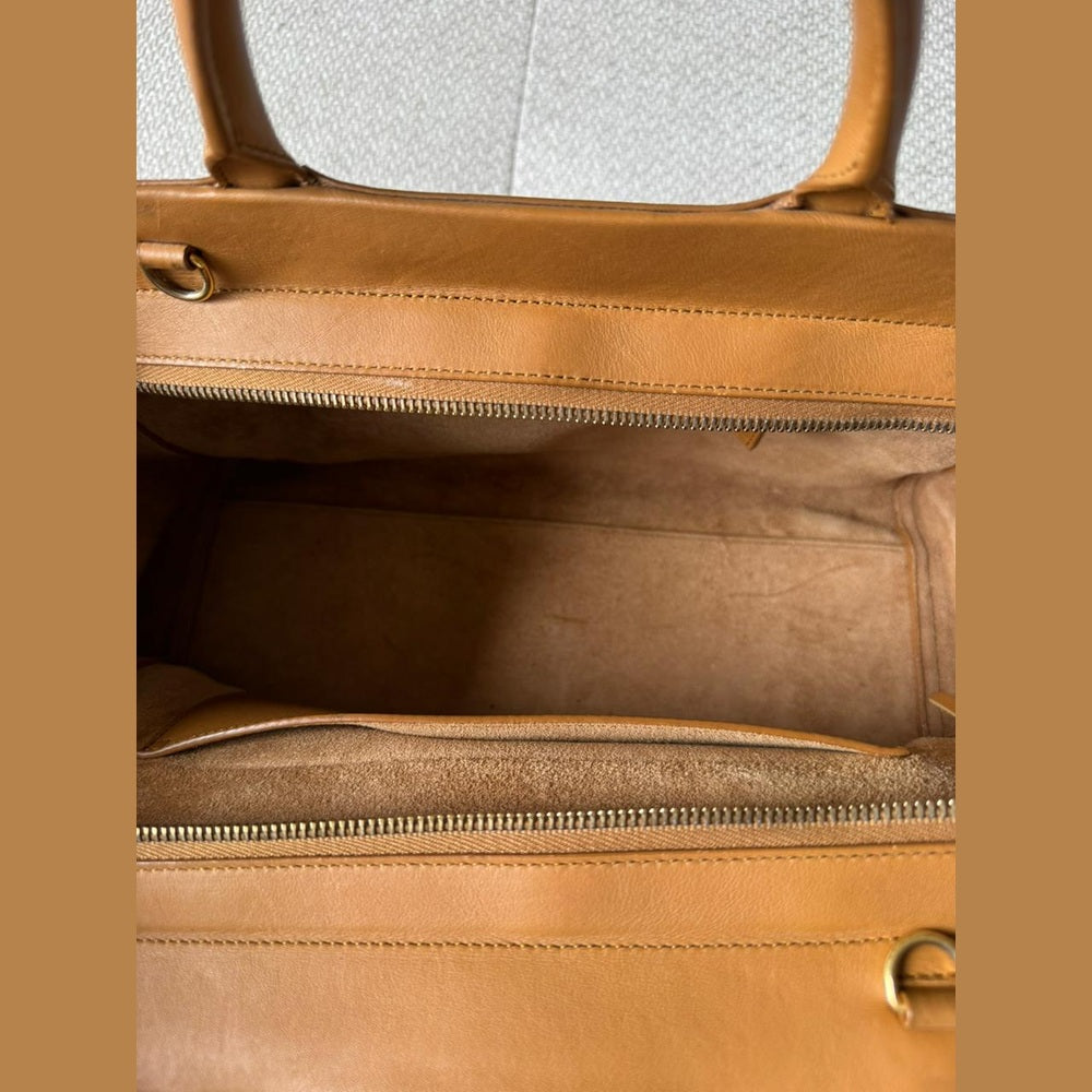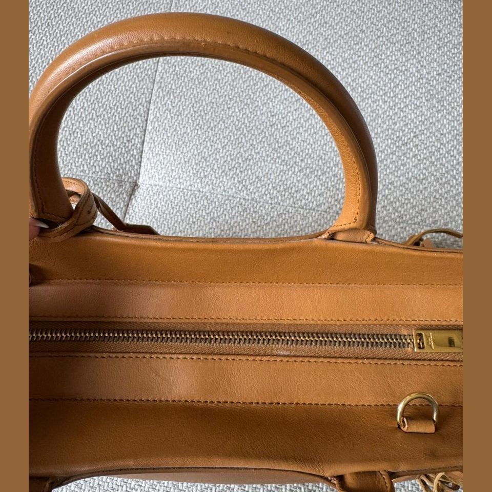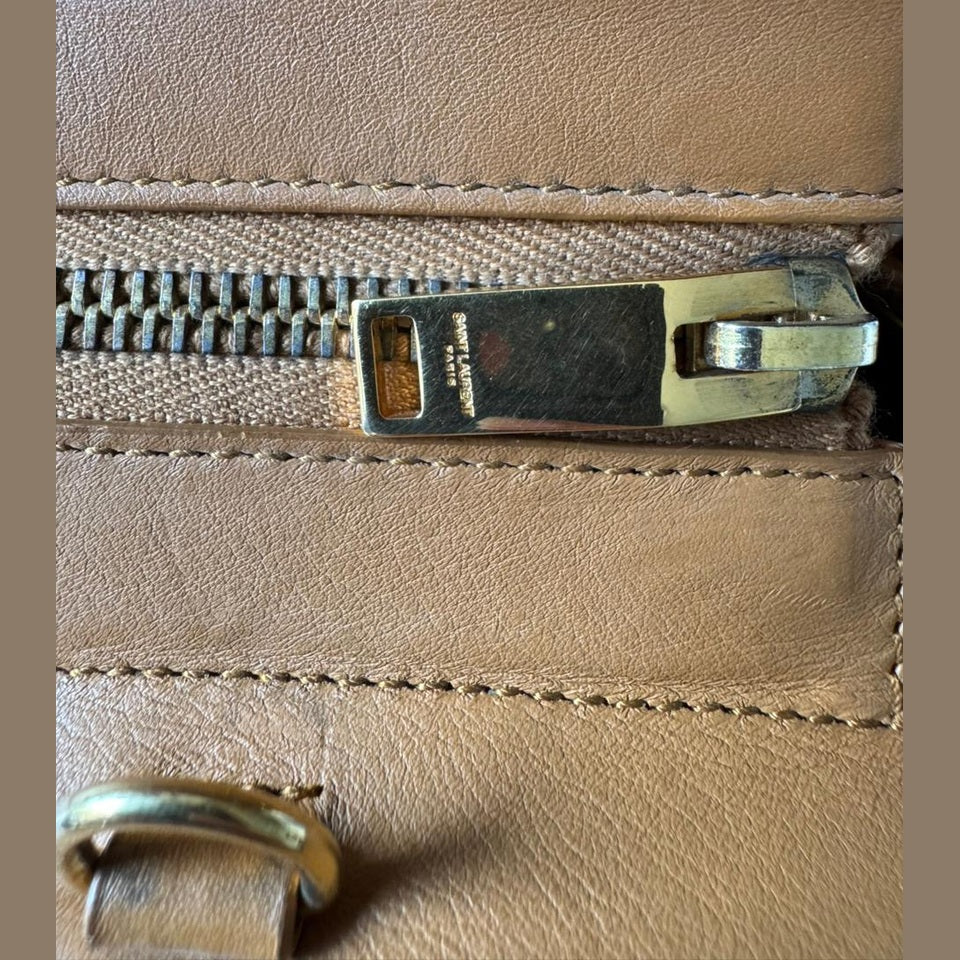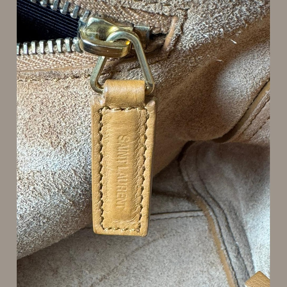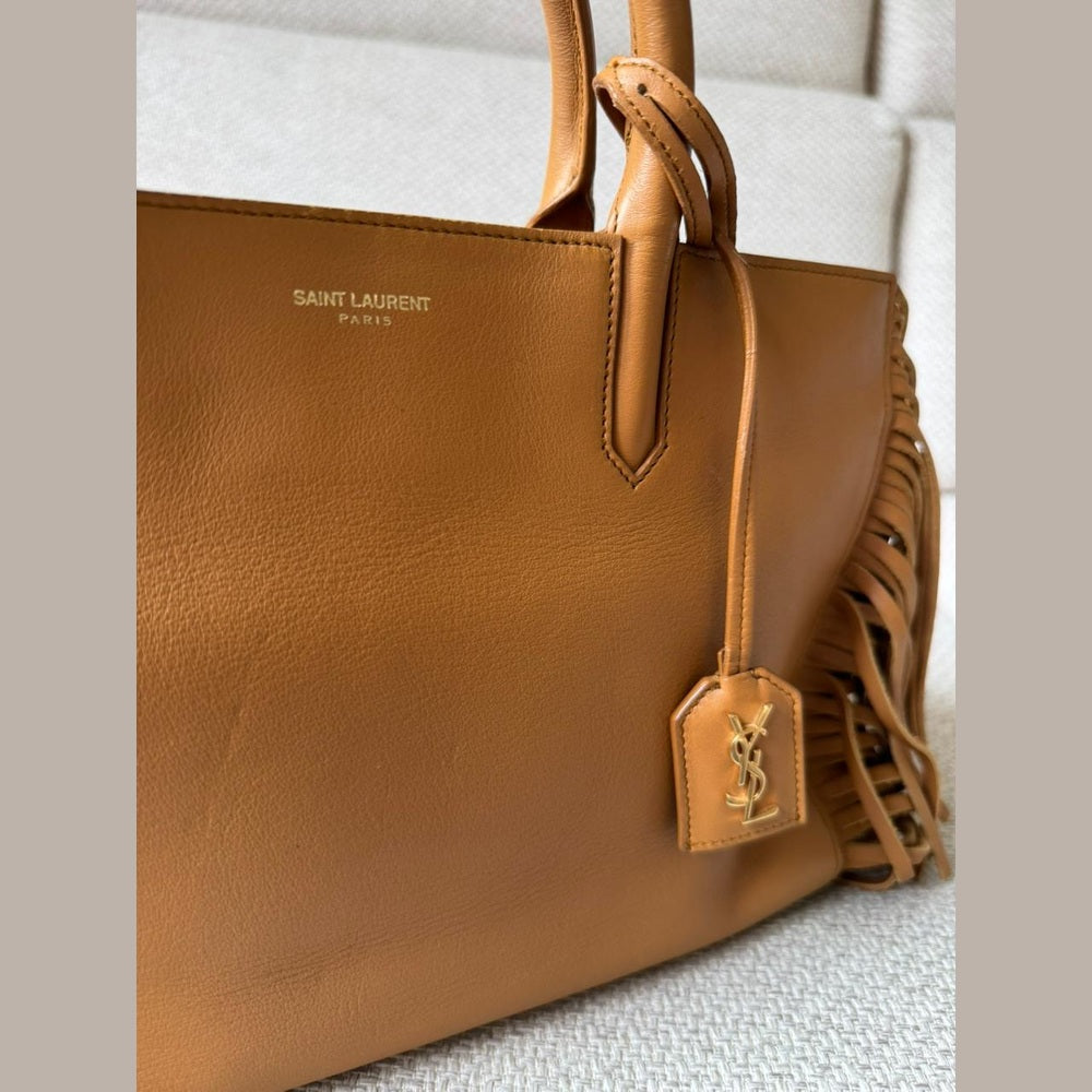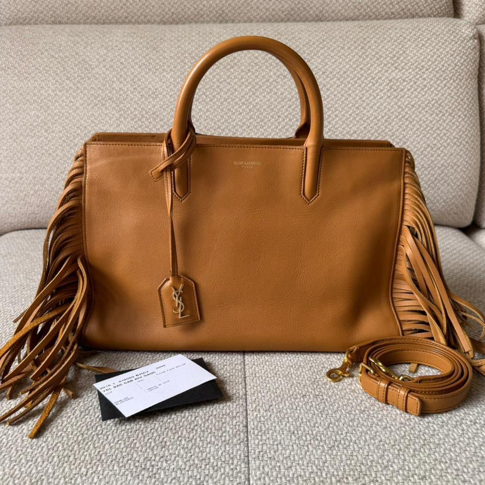A statement piece that blends Saint Laurent’s understated elegance with a bold bohemian edge, the Rive Gauche Fringe Satchel is crafted in smooth calfskin leather in a rich camel tone. The clean, structured silhouette is elevated by dramatic side fringe detailing, creating movement while maintaining a refined, timeless aesthetic. Finished with subtle Saint Laurent branding and gold-tone accents, this piece offers both practicality and distinctive style.