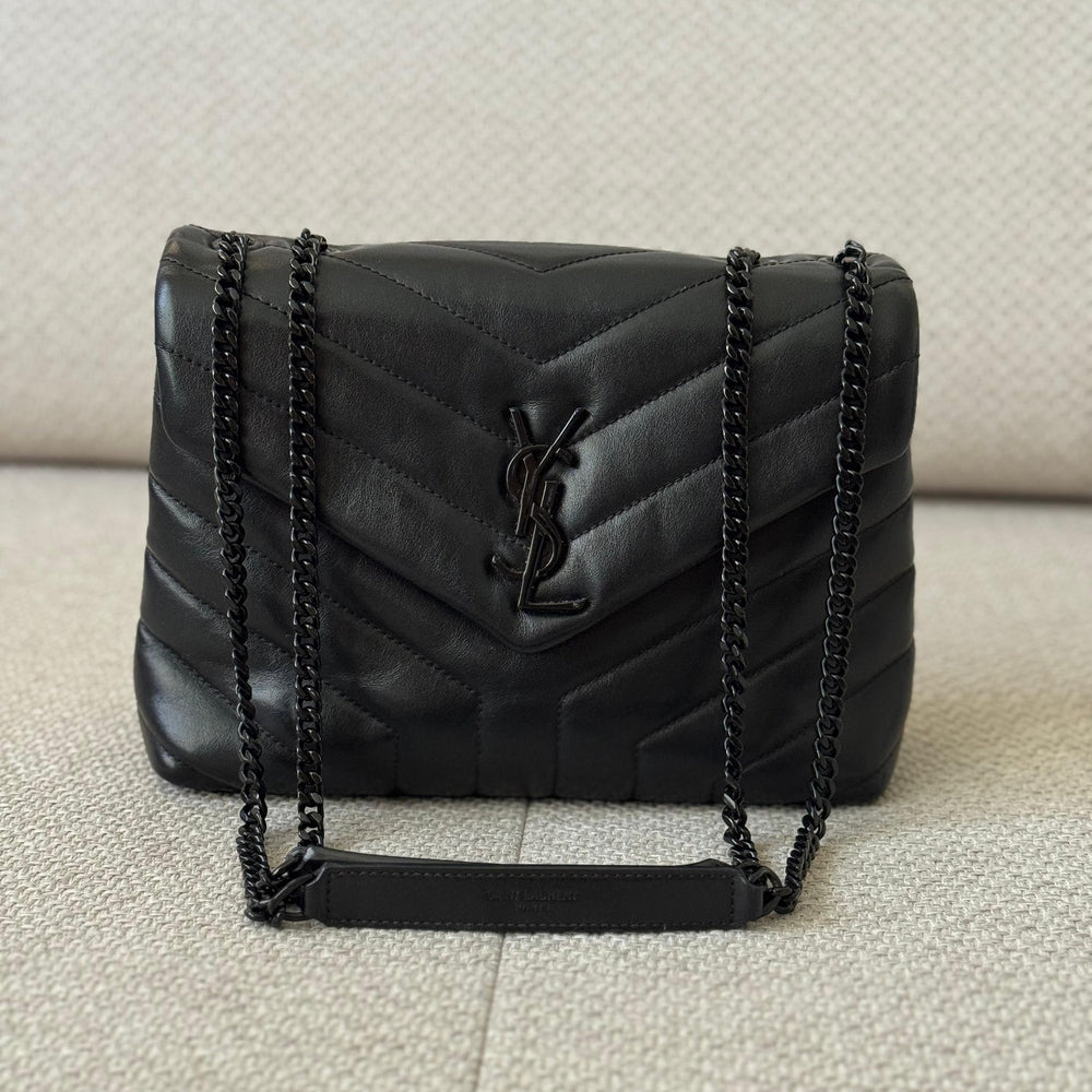The iconic Saint Laurent Small Loulou bag embodies timeless Parisian elegance with a modern edge. Crafted from smooth quilted calfskin leather in full black, it features the signature YSL Cassandre logo in tonal black metal for a sleek monochromatic finish.