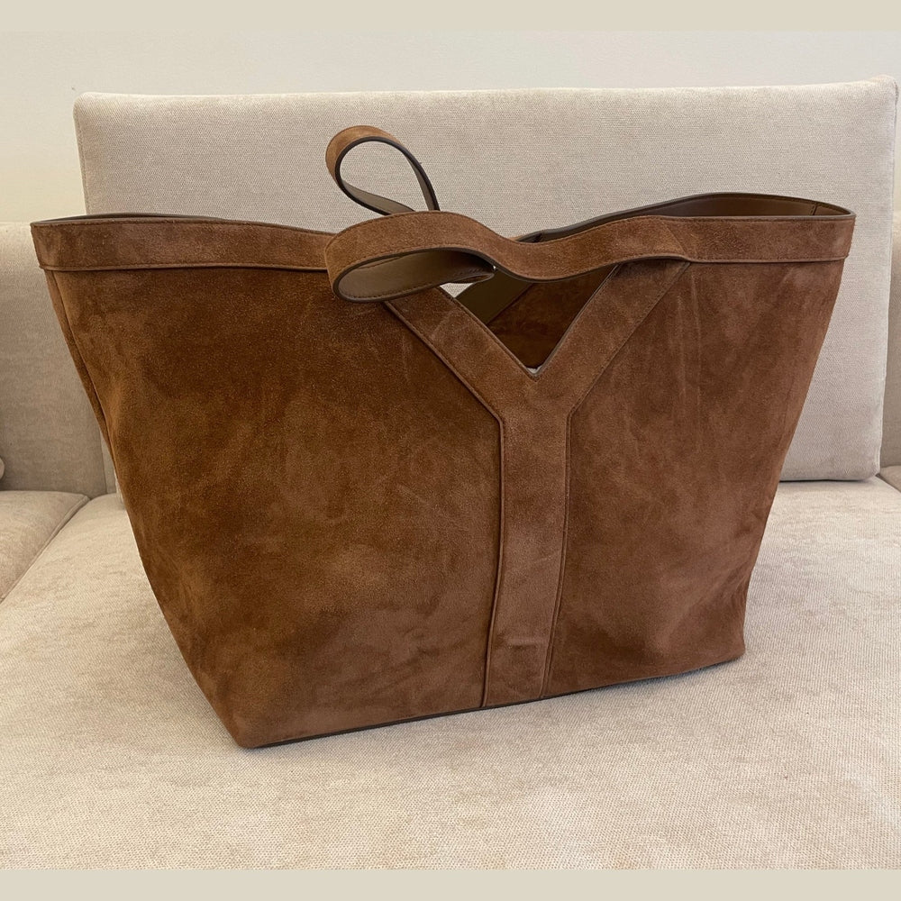 Effortlessly chic, the Saint Laurent 'Y' Tote in rich brown suede combines timeless design with everyday functionality. Crafted from supple suede, this spacious tote features the iconic 'Y' on the front side adding a touch of understated elegance. The structured silhouette and dual top handles make it perfect for daily use, while the roomy interior provides space for all your essentials. A sophisticated staple that seamlessly transitions from work to weekend. Comes with dustbag