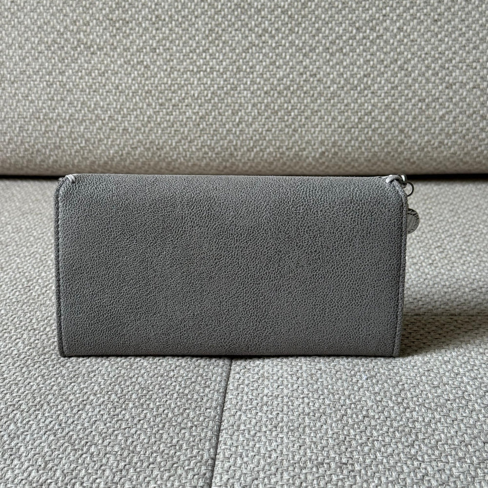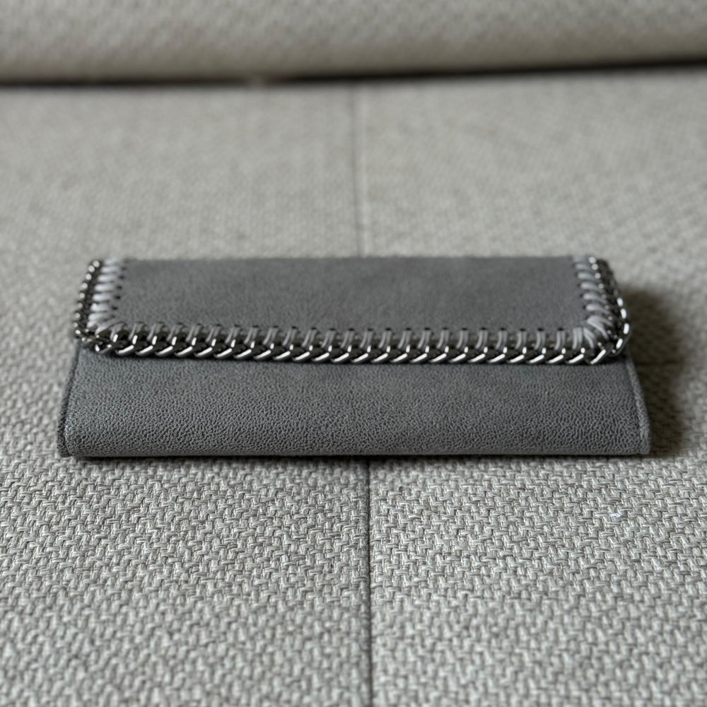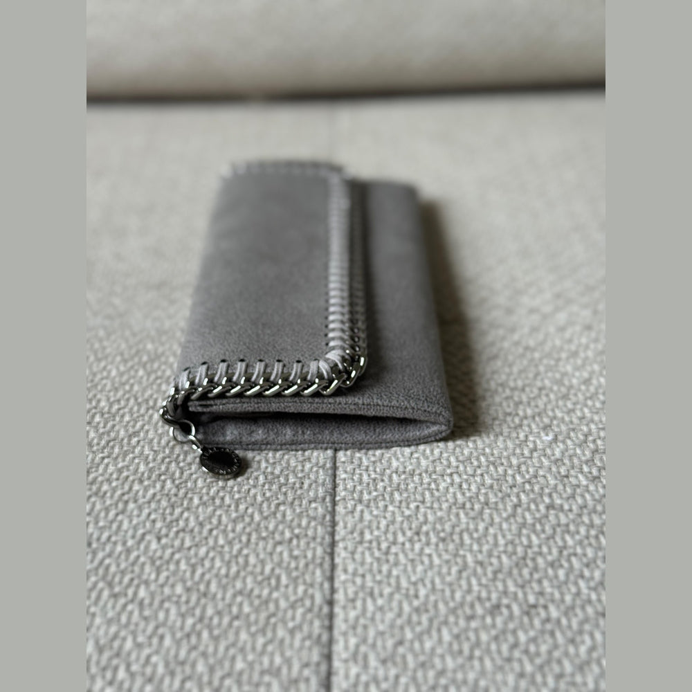 A chic and multifunctional piece from Stella McCartney’s iconic Falabella line, this grey wallet blends everyday practicality with the collection’s signature edgy elegance. Crafted from the brand’s renowned vegan Shaggy Deer material, it features the distinctive diamond-cut chain trim and whipstitch detailing that define the Falabella aesthetic.
