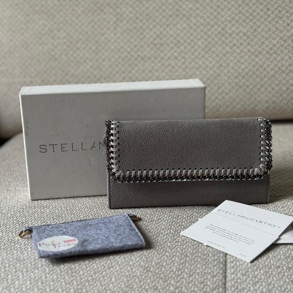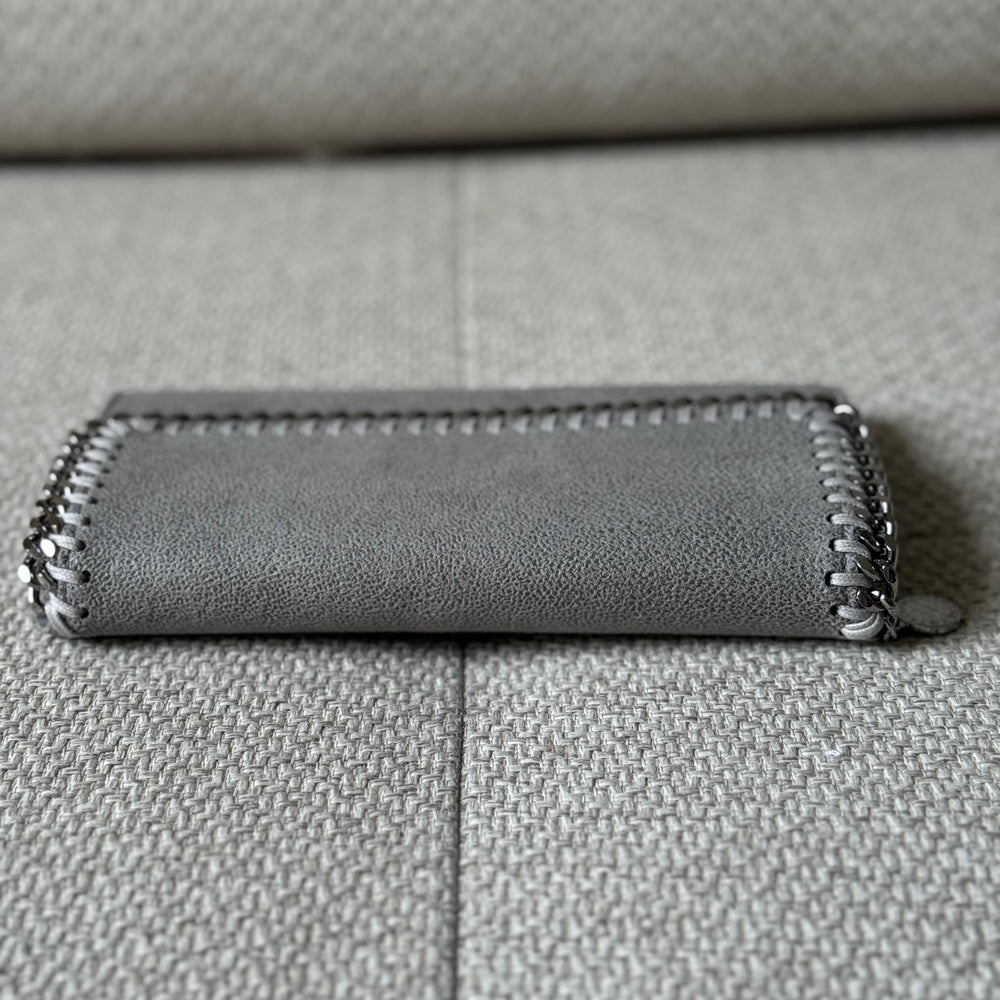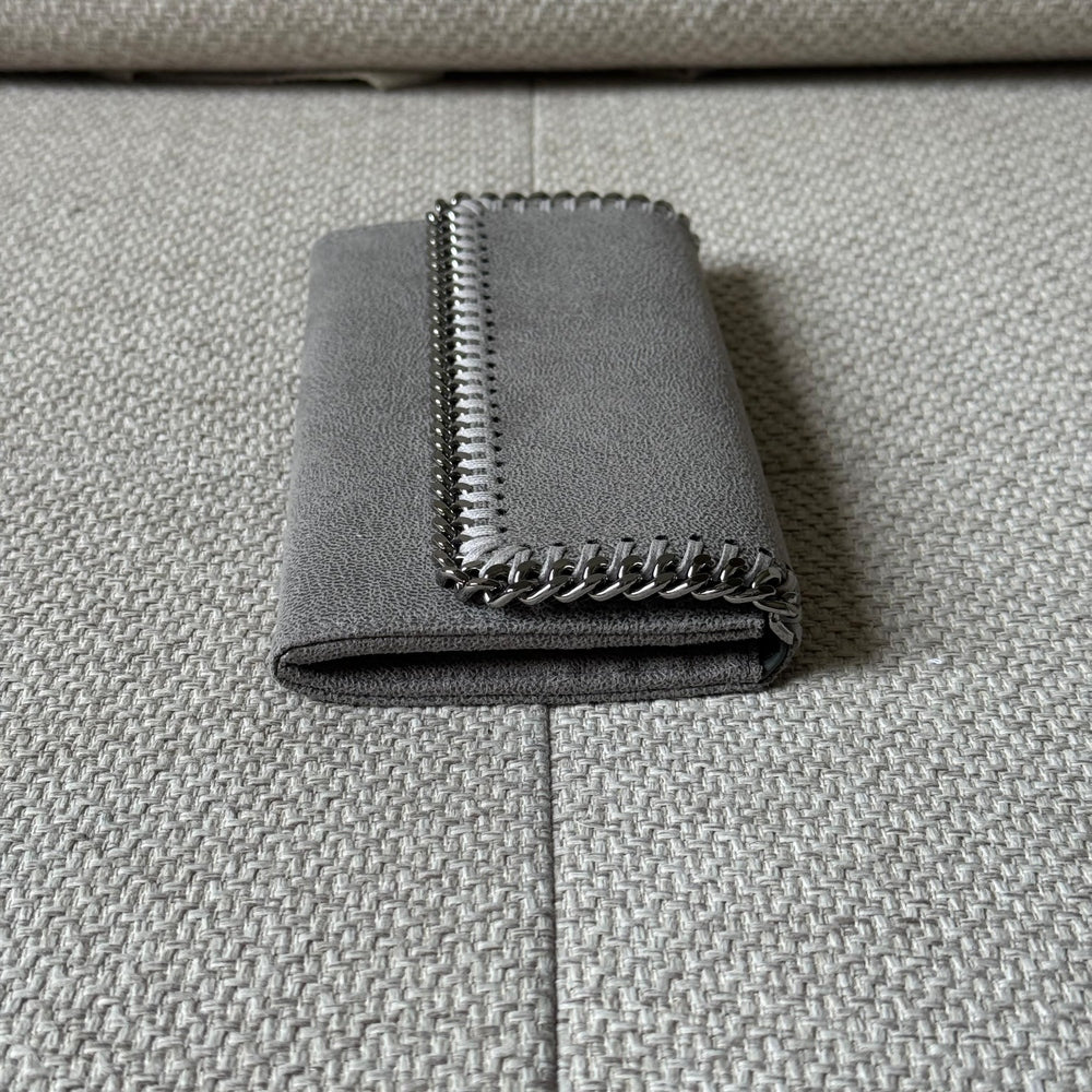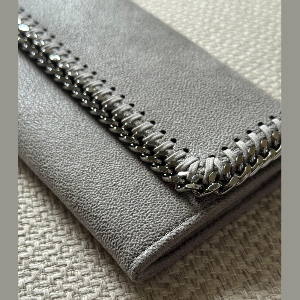 A chic and multifunctional piece from Stella McCartney’s iconic Falabella line, this grey wallet blends everyday practicality with the collection’s signature edgy elegance. Crafted from the brand’s renowned vegan Shaggy Deer material, it features the distinctive diamond-cut chain trim and whipstitch detailing that define the Falabella aesthetic.