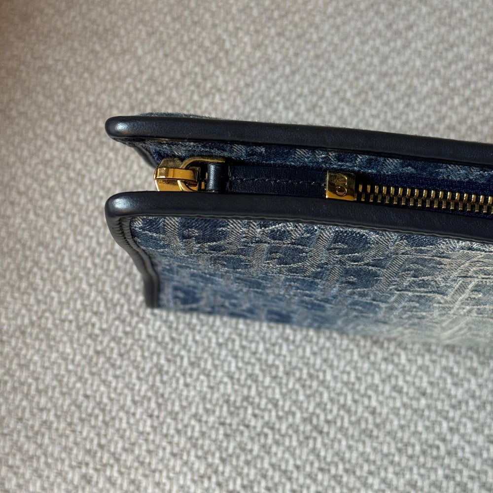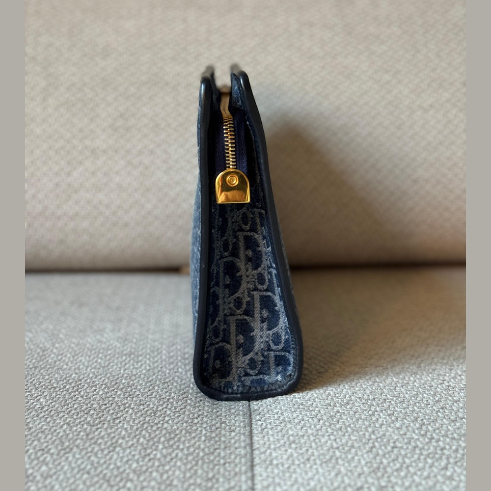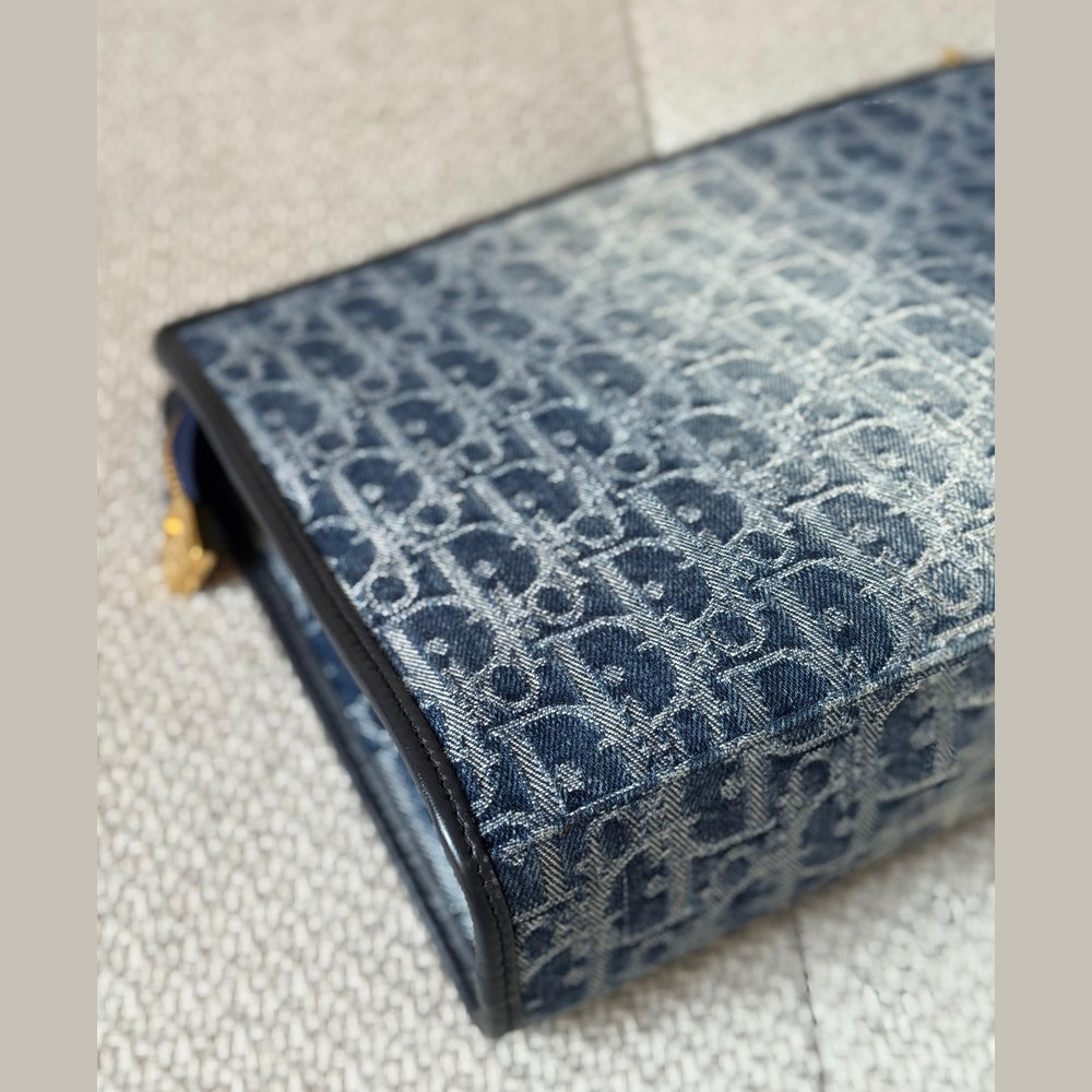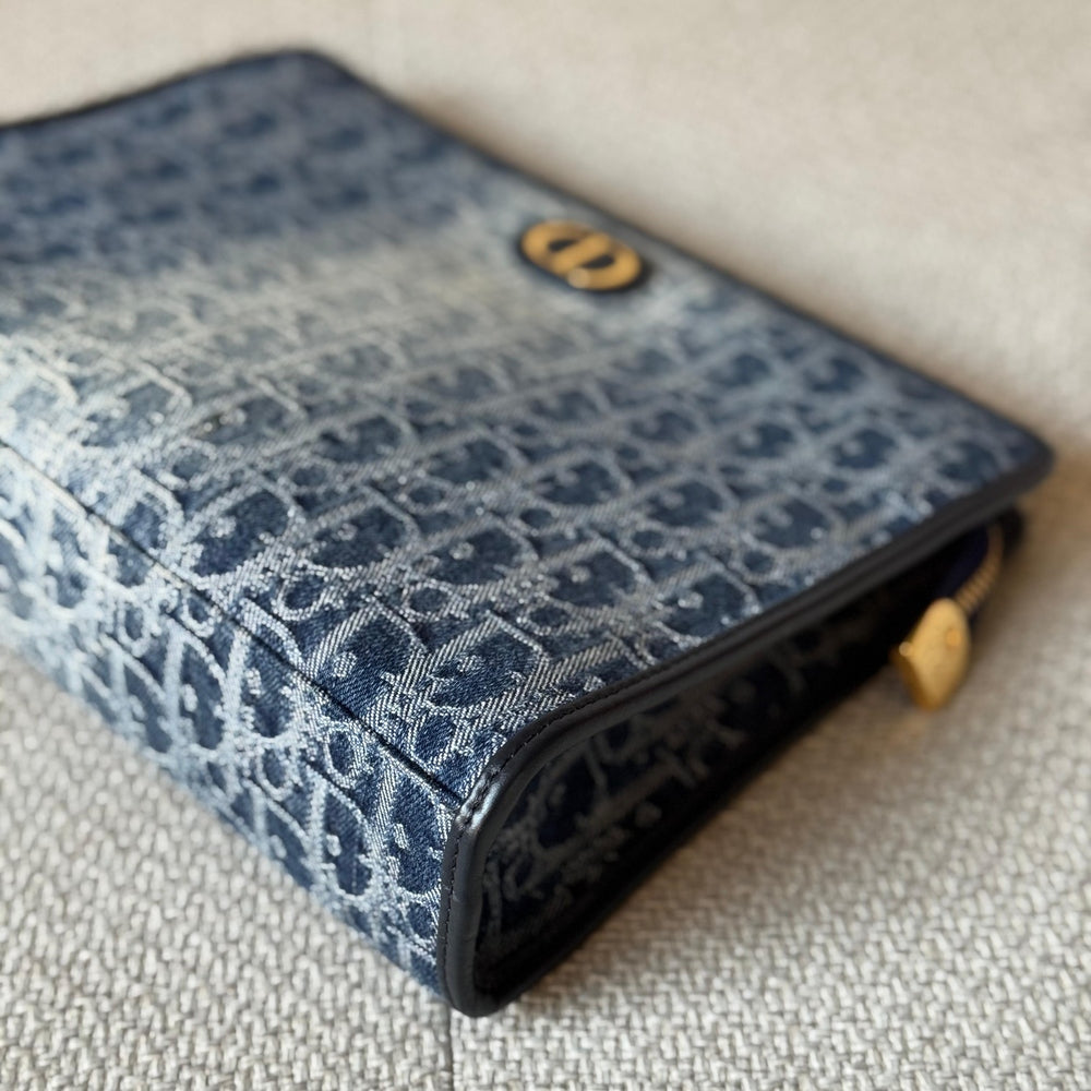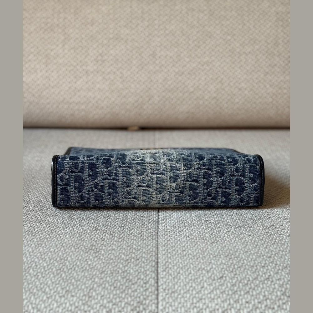 This Christian Dior Montaigne Pouch is crafted from iconic Dior Oblique denim, featuring a structured silhouette finished with refined leather trim and the signature CD clasp in gold-tone hardware.