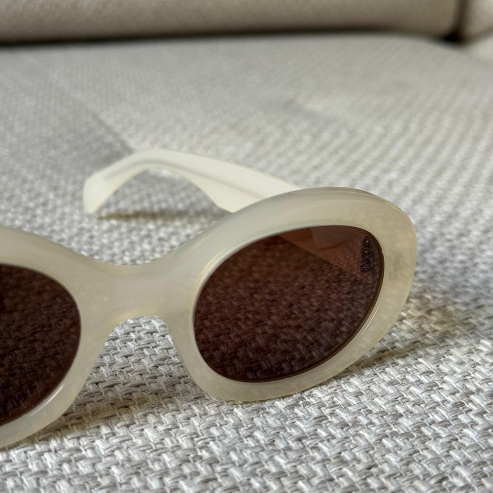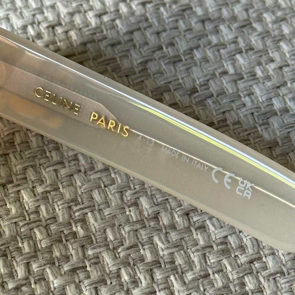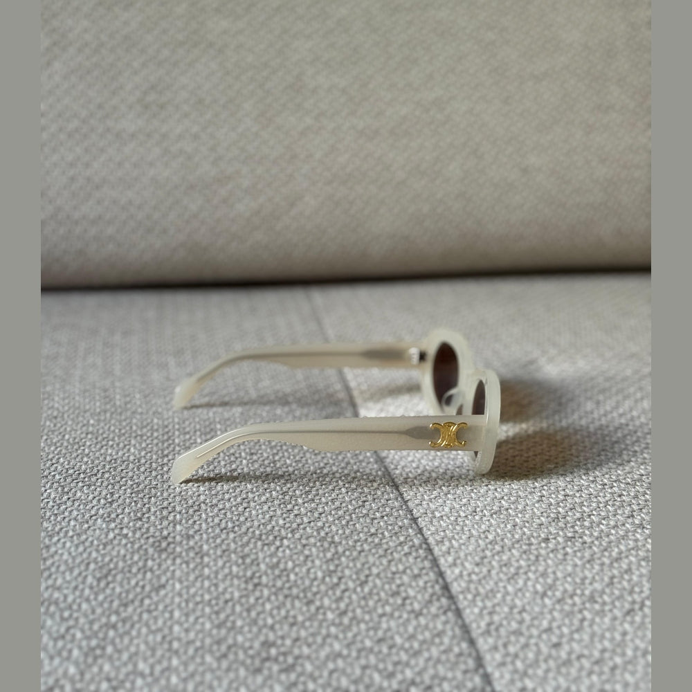 A fresh take on timeless chic, these Celine Oval Triomphe sunglasses elevate every look with a bold yet refined silhouette. Crafted in high-quality acetate, the clean white frame highlights the iconic gold Triomphe emblem on each temple — a signature symbol of Parisian luxury. The oval shape flatters most face types, offering a stylish blend of retro inspiration and modern edge.
