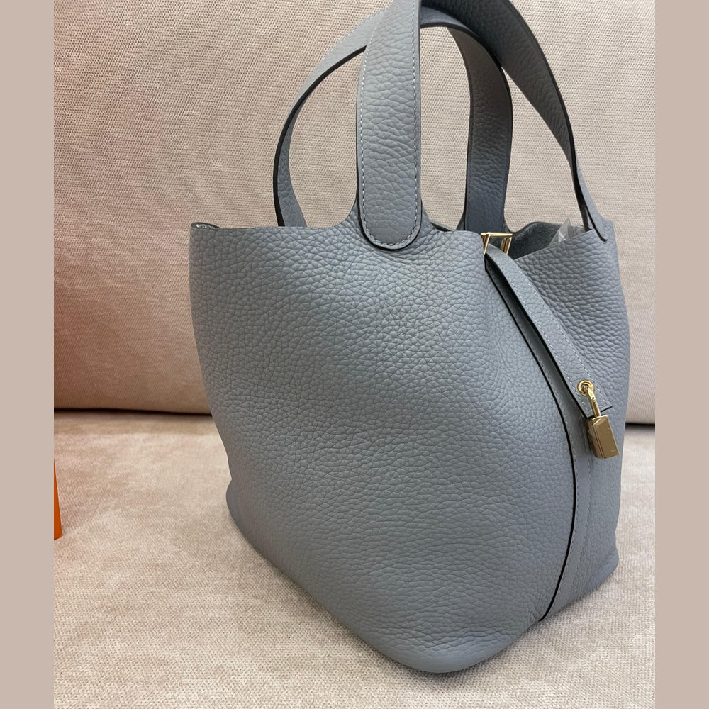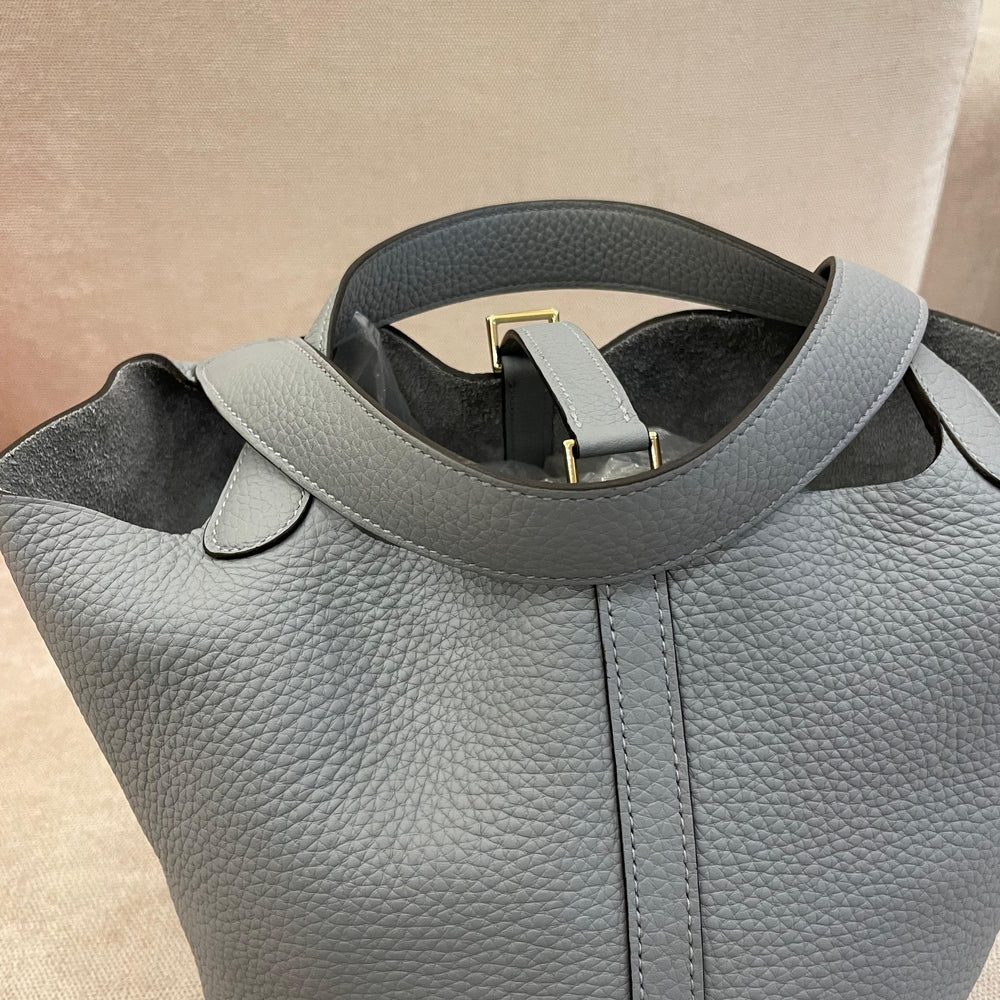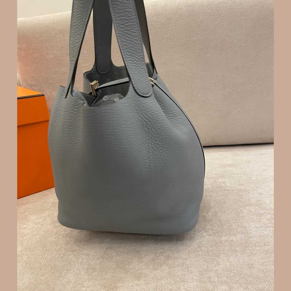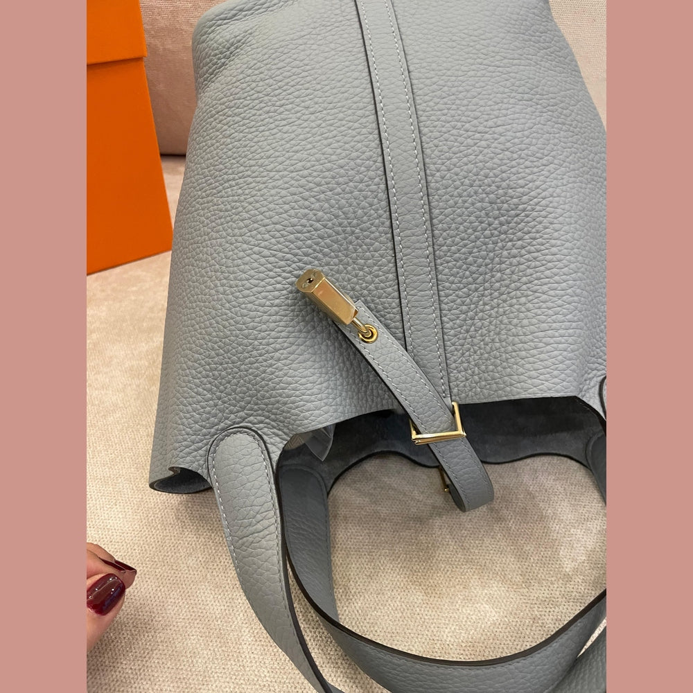 A timeless and minimalist Hermès bucket bag, crafted from soft and durable Clemence leather in Gris Pantin. Features a structured yet relaxed silhouette with a single top handle for hand or crook-of-arm carry. Finished with polished gold-tone hardware and a simple leather strap closure with lock and key that enhances its effortless style. The interior offers a single open compartment for daily essentials, combining understated elegance with functionality.