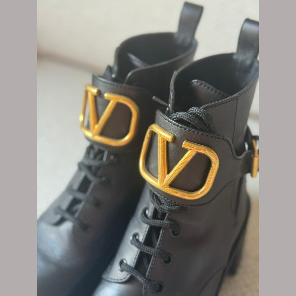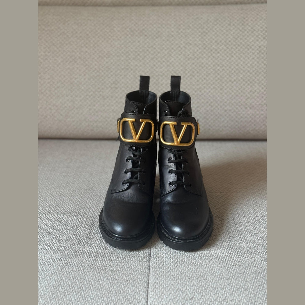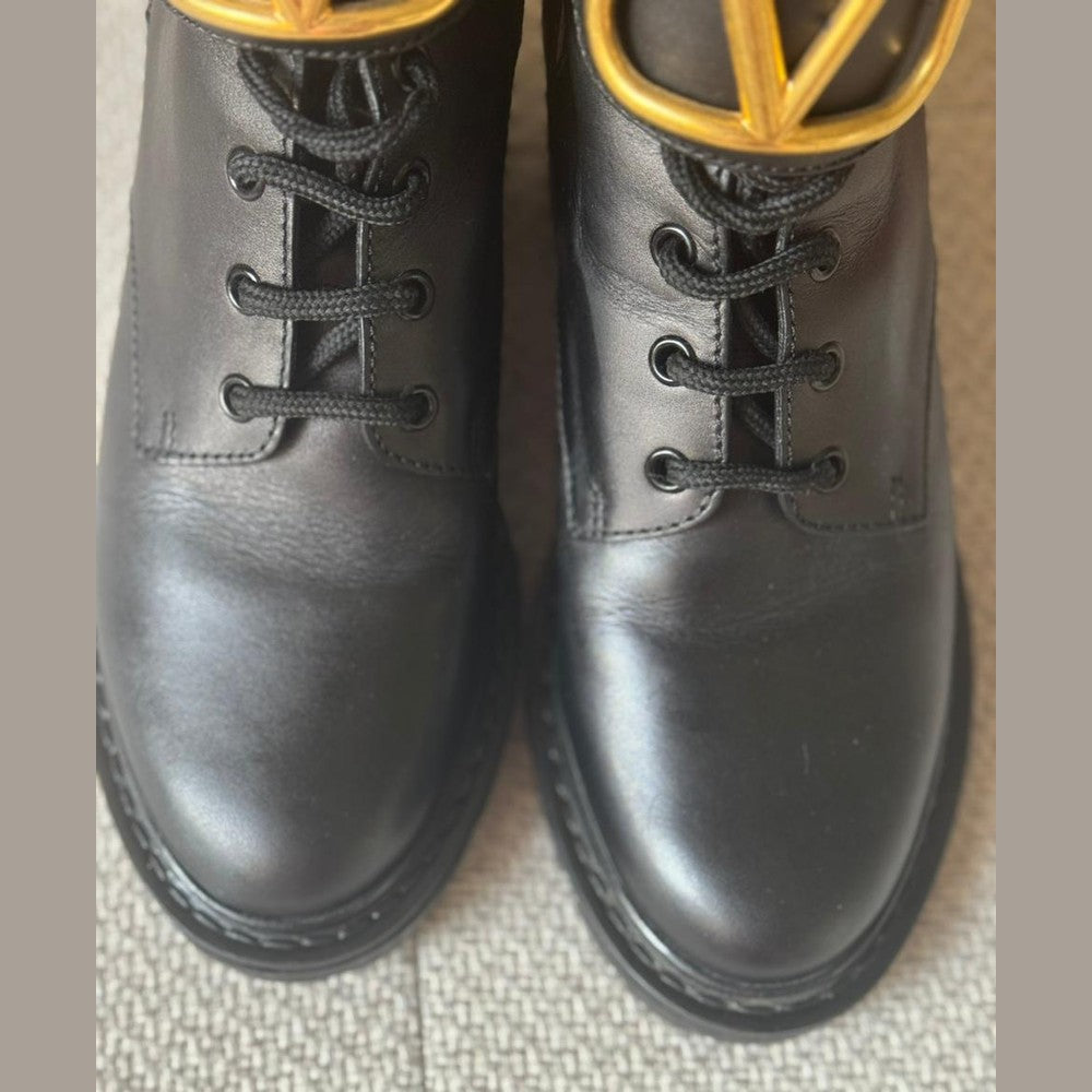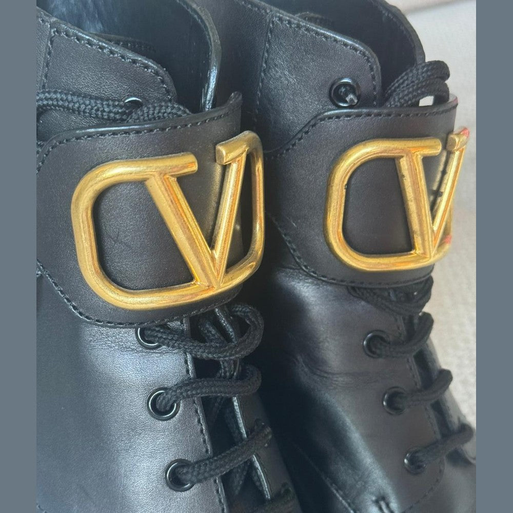 Crafted from smooth black calfskin leather, these Valentino combat boots feature the iconic oversized gold VLogo hardware for a bold and modern statement. Designed with lace-up fastening and an adjustable ankle strap for added support and style. The chunky block heel and durable lug sole provide comfort, stability, and an elevated edge—perfect for everyday wear with a touch of luxury.