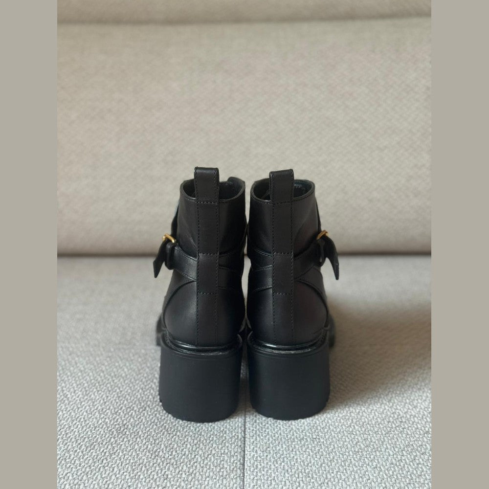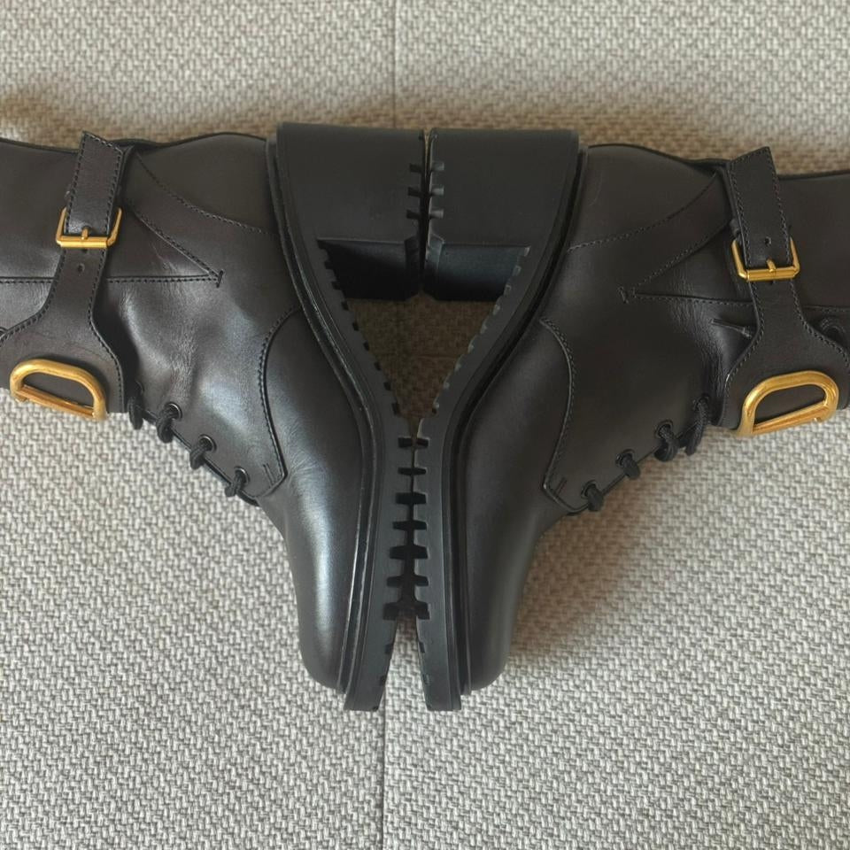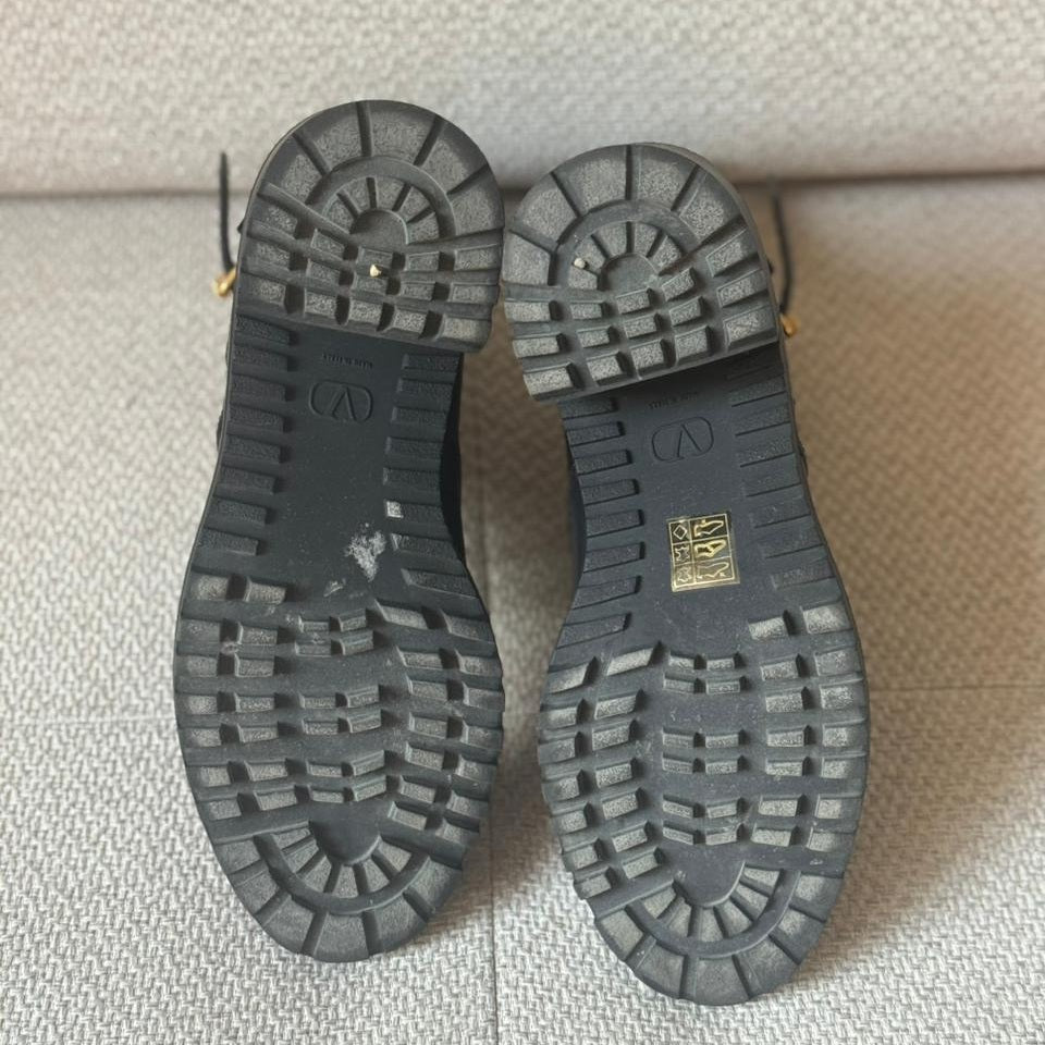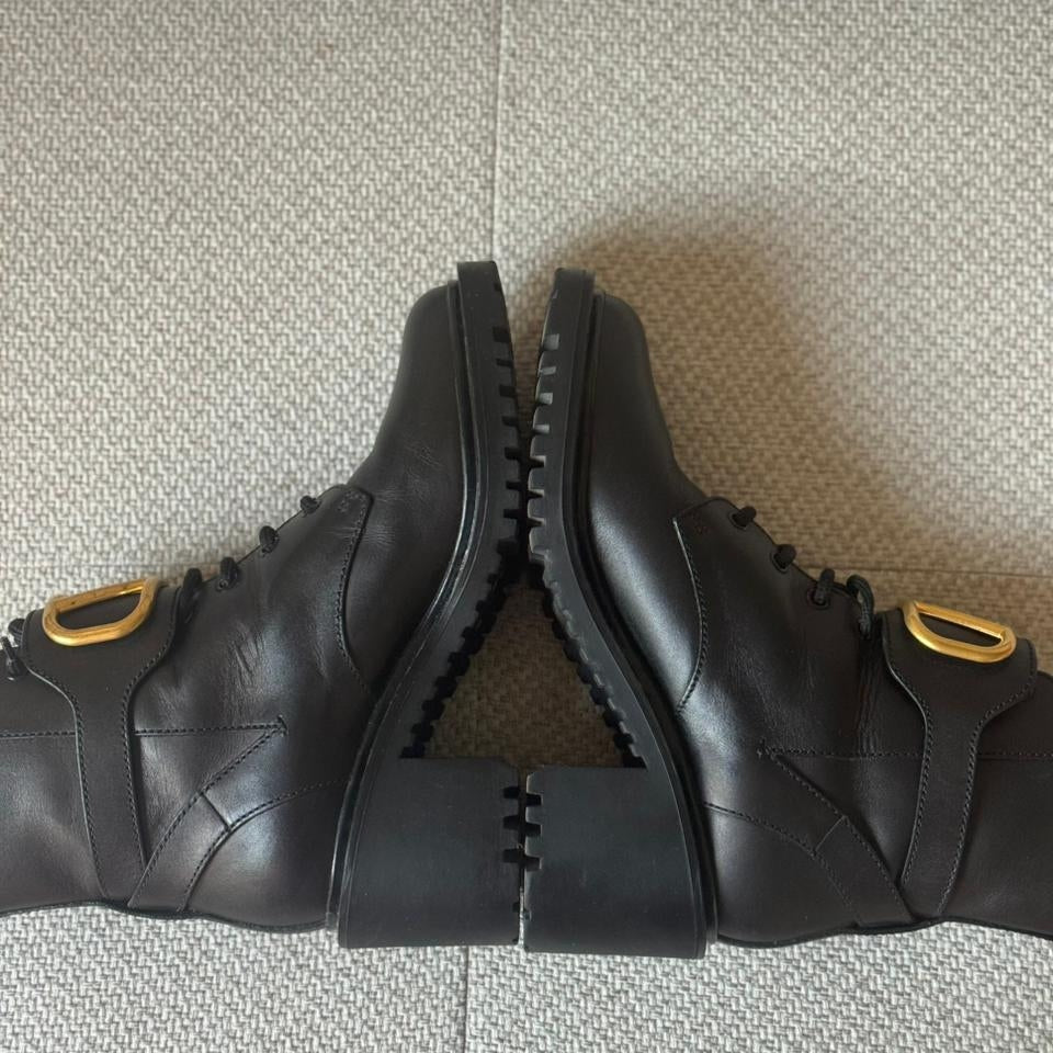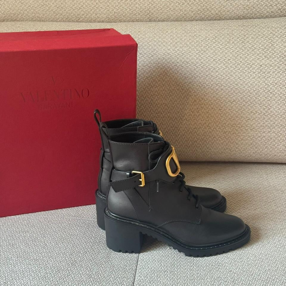 Crafted from smooth black calfskin leather, these Valentino combat boots feature the iconic oversized gold VLogo hardware for a bold and modern statement. Designed with lace-up fastening and an adjustable ankle strap for added support and style. The chunky block heel and durable lug sole provide comfort, stability, and an elevated edge—perfect for everyday wear with a touch of luxury.